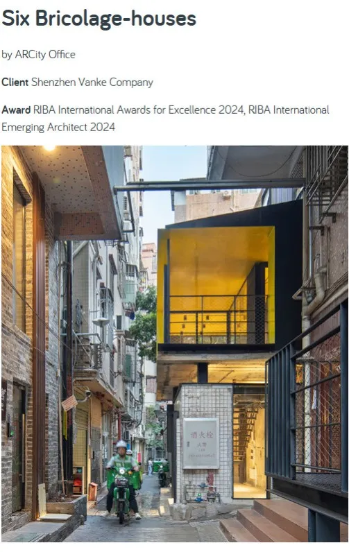 The winners of these two annual awards were selected from the 22 global winning projects and architectural firms announced on June 12, 2024, for the RIBA International Awards for Excellence 2024. The "Six Bricolage-houses" project, led by Zhang Yuxing and Han Jing from ARCity Office, was one of the 22 winning projects of the RIBA International Awards for Excellence.