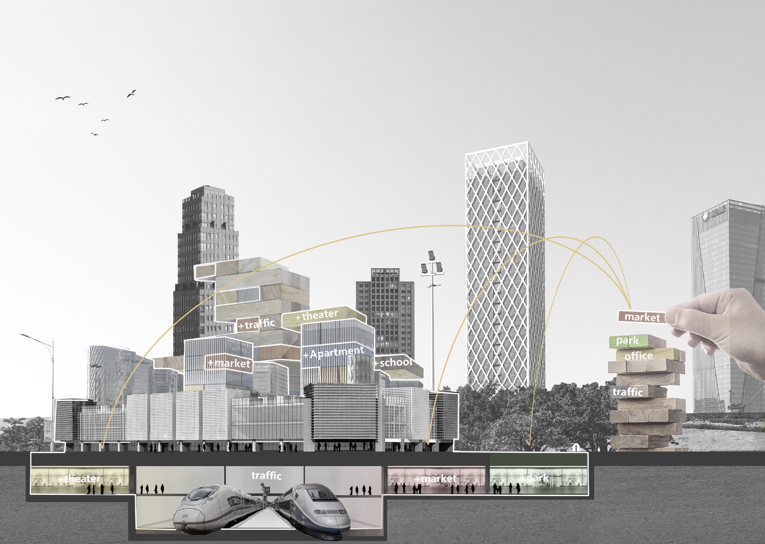 [站城一体]:[轨道枢纽核心区]与[立体化开发]