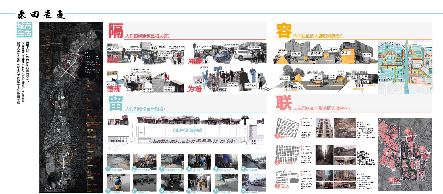 展览以“村城互补”为主题,讲述了生活在坂田城中村的市井生活与百姓自发性创造的城市活力。本展览收录了五和大道周边的14条城中村的别样风情,对比千城一面的规划,城中村更显鲜明个性与活力。看似封闭的城中村却包容的承载着来自全国各地的梦想,村与城联系的频繁与增强促使原本封闭的城中村也逐步趋向城市化。村城融合与共生也带来给城中村前所未有的机遇与重生的无限可能。