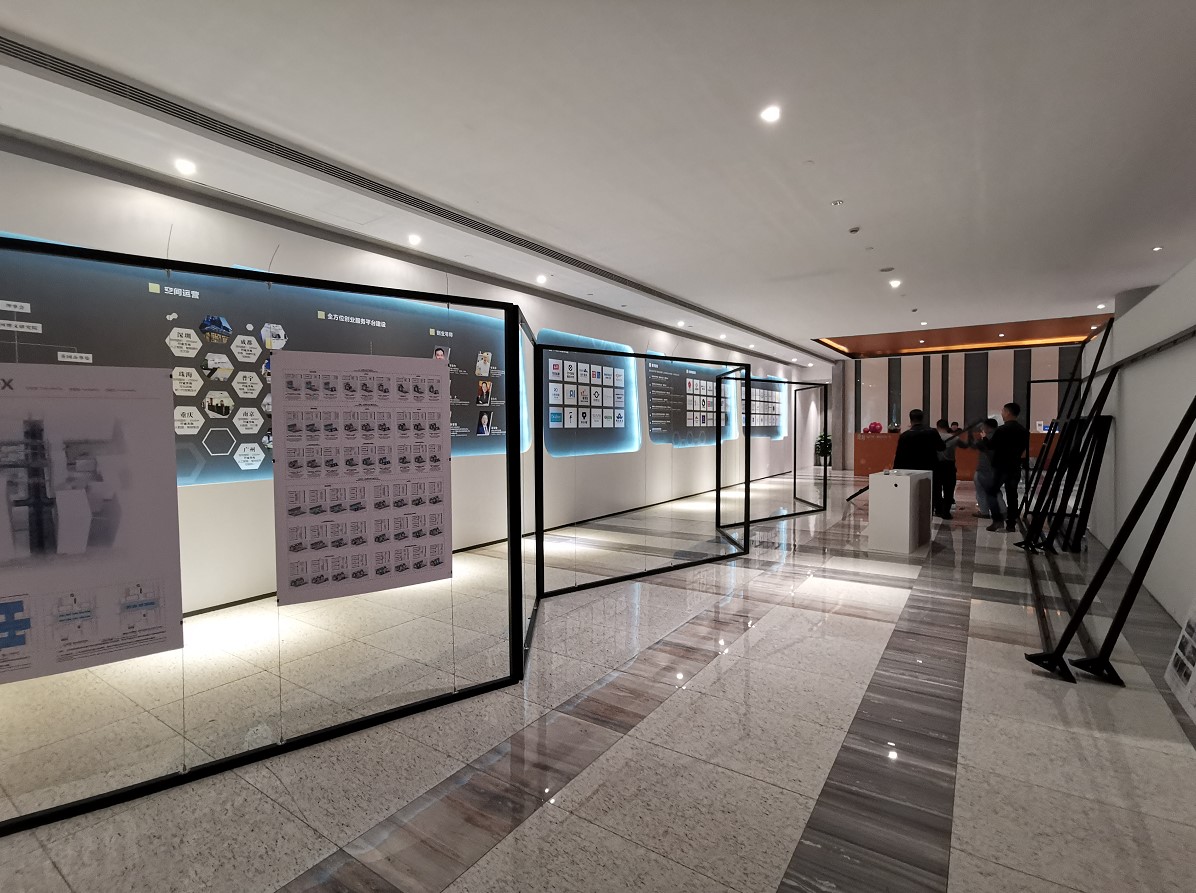 本次“深双”的主题为“城市交互”,下面有设“城市之眼”、“城市升维”两个版块。主展场的场地面积非常有限但是展品数量丰富,所以展陈的作品、方案都处于随时调整的状态。考虑到上述因素,深大教师们采用了能适应变化且简单高效的独立结构体系——模块化墙体来进行展场的搭建。这样墙体由统一的单元模块构成,其大小、位置就可以根据现场情况进行随时调整。