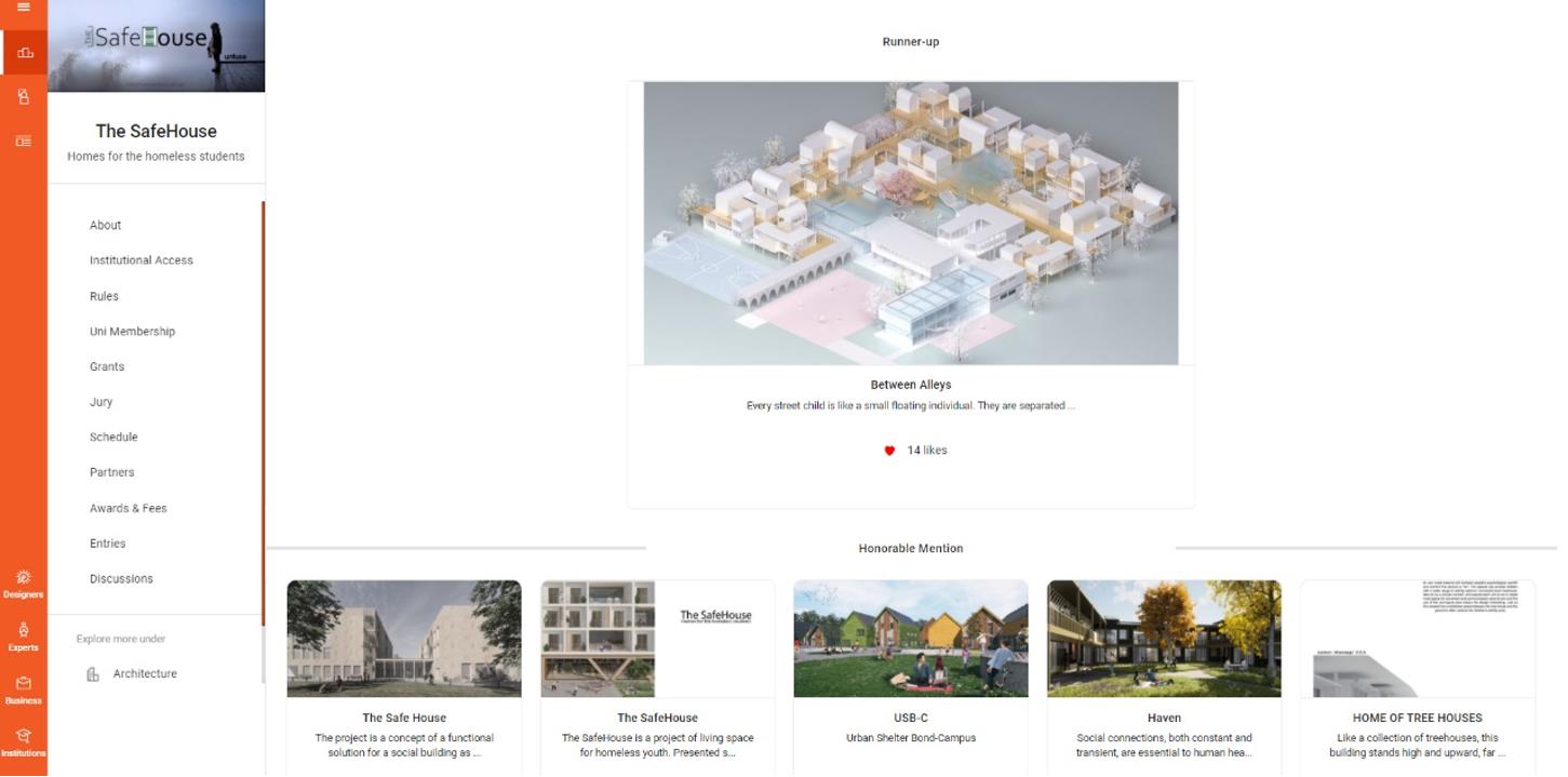 2021年3月13日,由UNFUSE主办的国际设计竞赛“The SafeHouse: Homes for the homeless students”(安全屋:流浪学生之家)宣布获奖名单。深圳大学建筑与城市规划学院2020级建筑学学硕学生苏泽勇、欧阳洋、周伦的作品《Between Alleys》(指导教师:何川)在本次竞赛中荣获“Runner-up“(亚军)奖项。本次竞赛共收到来自不同国家和地区的68份参赛作品,由Assembledge+建筑事务所创始人David Thompson、Rangr Studio创始人Jasmit Rangr、KDa事务所创始人Kevin Daly担任评审。