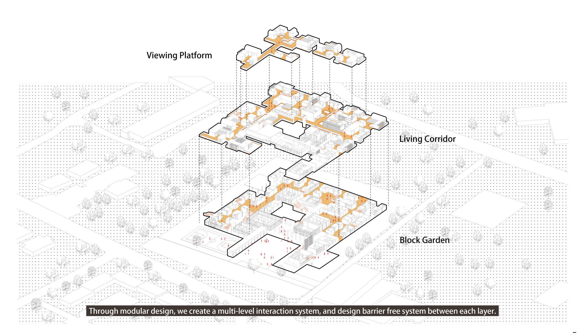 SafeHouse目前的设计分三层,由于整体是分散式布局,底层的空间十分流通,可达性很强,住在不同组团的孩子们可以走街串巷,相互交流。二层的平台也是大家主要交流和活动的区域,一二层的宿舍组团会共用一个小花园,组团内有楼梯可以上下,以达到组团更多的互动。在二层也插入了很多的公共空间,比如露天舞台和阅读室,主要分布在内部庭院周围,有方便的楼梯可供上下,使得整个社区在垂直空间上可以形成互动,此外,随着模块化的设计,本社区也可以在此基础上像树一样竖向成长,为更多计划外的流浪儿童提供帮助。