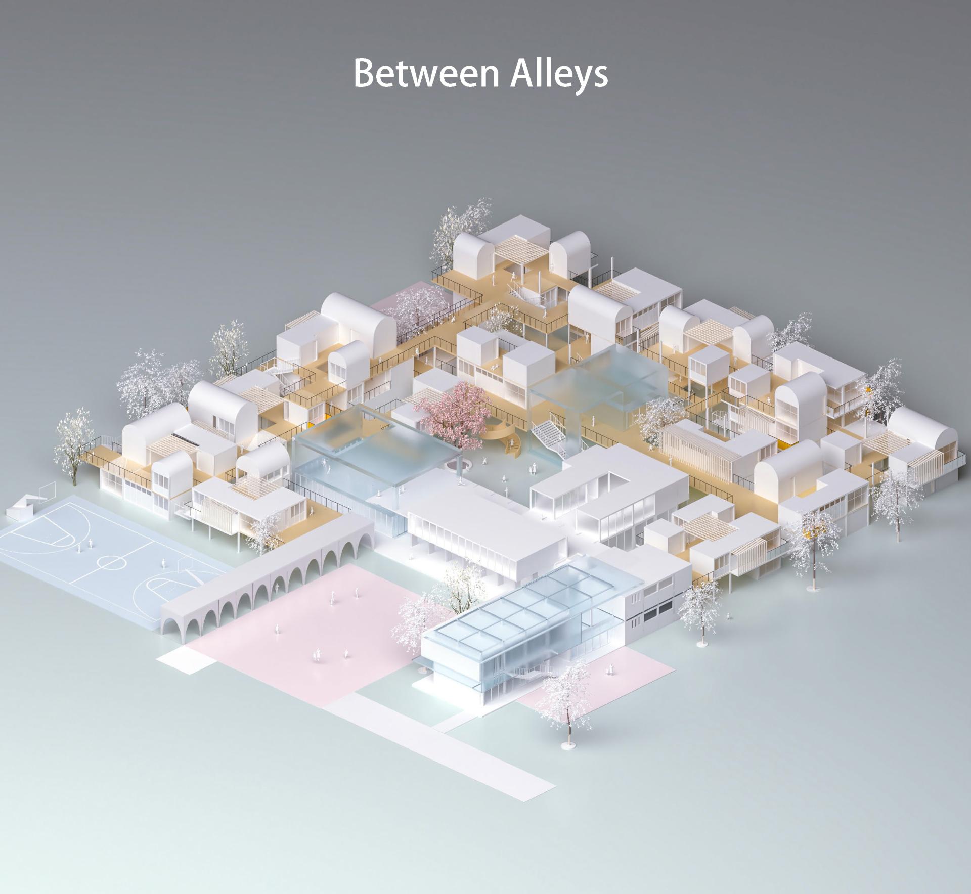 苏泽勇、欧阳洋、周伦三位研究生提交的设计方案《Between AIIeys》,通过立体聚落的空间布局方式,回应这次竞赛对无家可归者的场所要求。在满足使用者的基本居住及安全要求的基础上,通过街、巷、院落的空间建构,创造适合无家可归学生的相互交往、学习以及其它个性化的空间。此外,通过标准构件组合成适应不同使用者的模块及组合单元,以适应当下及未来的发展变化。