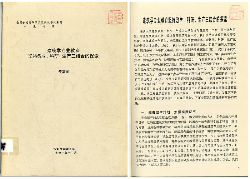 1992年当建筑学专业评估即将展开之际,黄莘南教授是率先熟悉并未雨绸缪、着手准备建筑学专业评估的学院骨干之一,他也是1996年第一次专业评估期间、撰写与优化建筑系评估报告的主要撰稿人之一,在当年评估视察组同济大学卢济威教授为首的各位专家的指导下,最终圆满取得深大建筑学当年顺利通过专业评估的优秀成果。同年,黄莘南教授参与申报的建筑设计及其理论专业硕士点获批,成为深圳大学第一批获得硕士学位授予权的单位。