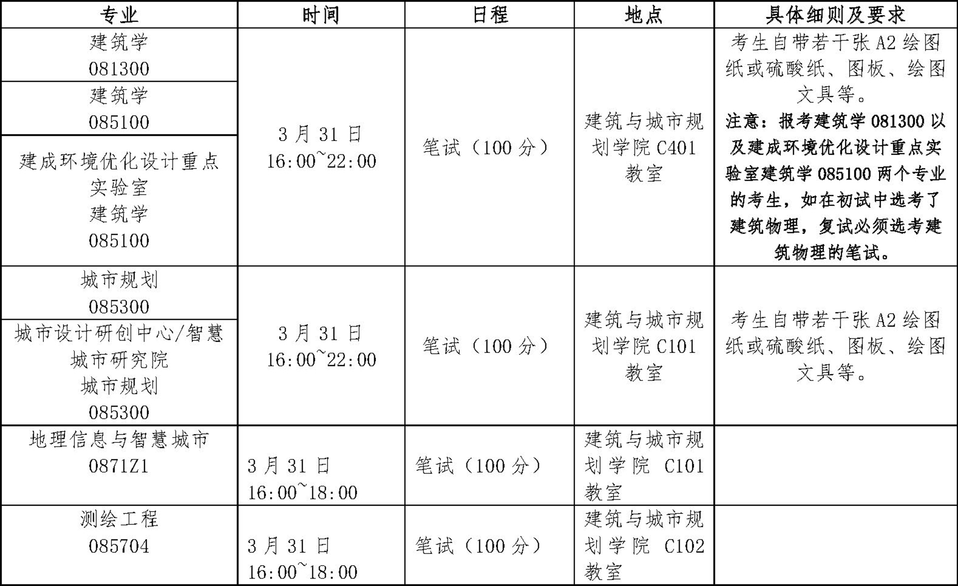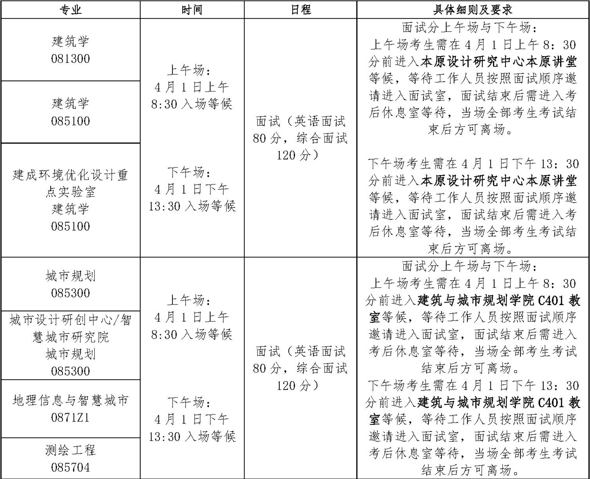 3、面试场次及面试顺序,将在3月31日报到抽取复试顺序后确定,届时将会公布在建筑与城市规划学院官网,请考生在笔试考试结束后留意学院官网信息,根据自己所分上午场或下午场准时到达对应的候考室等候。