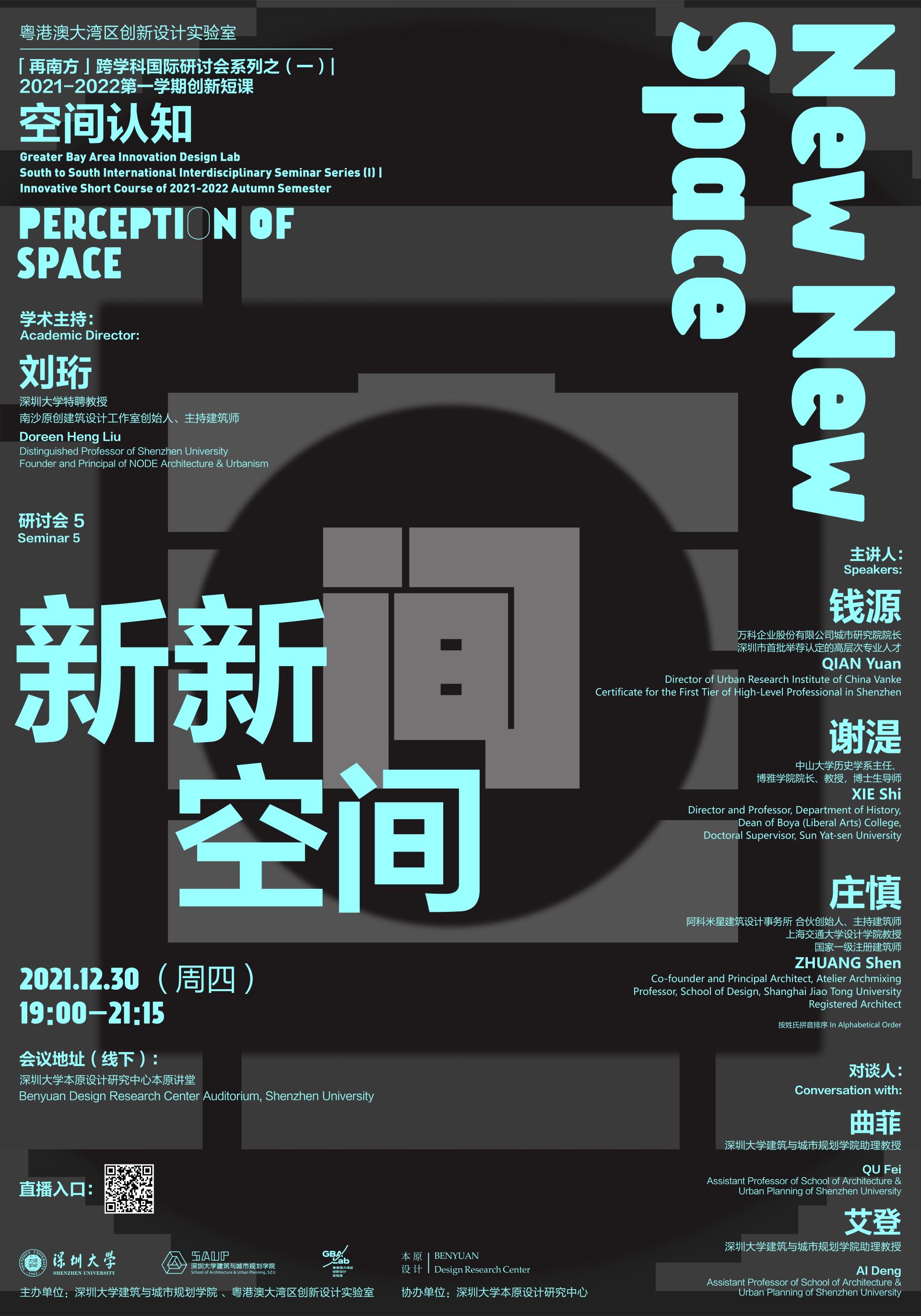 「再南方」系列研讨会2021年秋季学期的主题为“空间认知”,共设六讲,包括五讲研讨会和一讲汇报总结。五讲研讨会基于“不确定性”和“改变”,分别围绕五个主题:人·尺度、家·日常、设计(不)创新、气候变化和新新空间,从研究和实践两个维度展开。研讨会由刘珩教授策划并主持,邀请国际国内的建筑师和学者,与艺术家、社会学家、人类学家和地理学家展开跨界跨学科对话,将艺术、美育、人文纳入建筑学的探讨,探讨建筑学未来面临的问题。