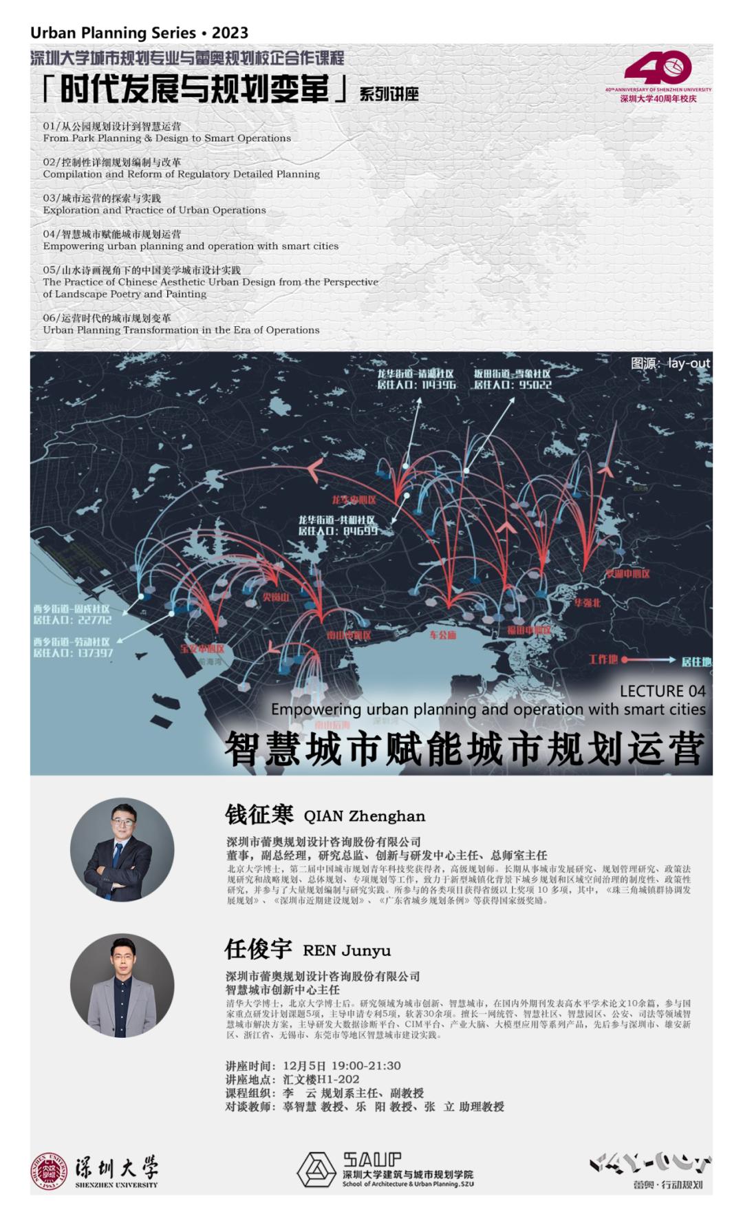 “时代发展与规划变革” 课程是深圳大学城市规划专业与蕾奥规划的校企合作课程之一,由蕾奥规划各专业领域的技术核心联合呈献。第四讲围绕“智慧”与“城市”,介绍智慧城市的概念内涵与发展现状,探讨作为规划学科背景下的规划人如何参与智慧城市建设,如何应用智慧技术、产品、思维赋能城市规划、建设、管理、运营全过程。