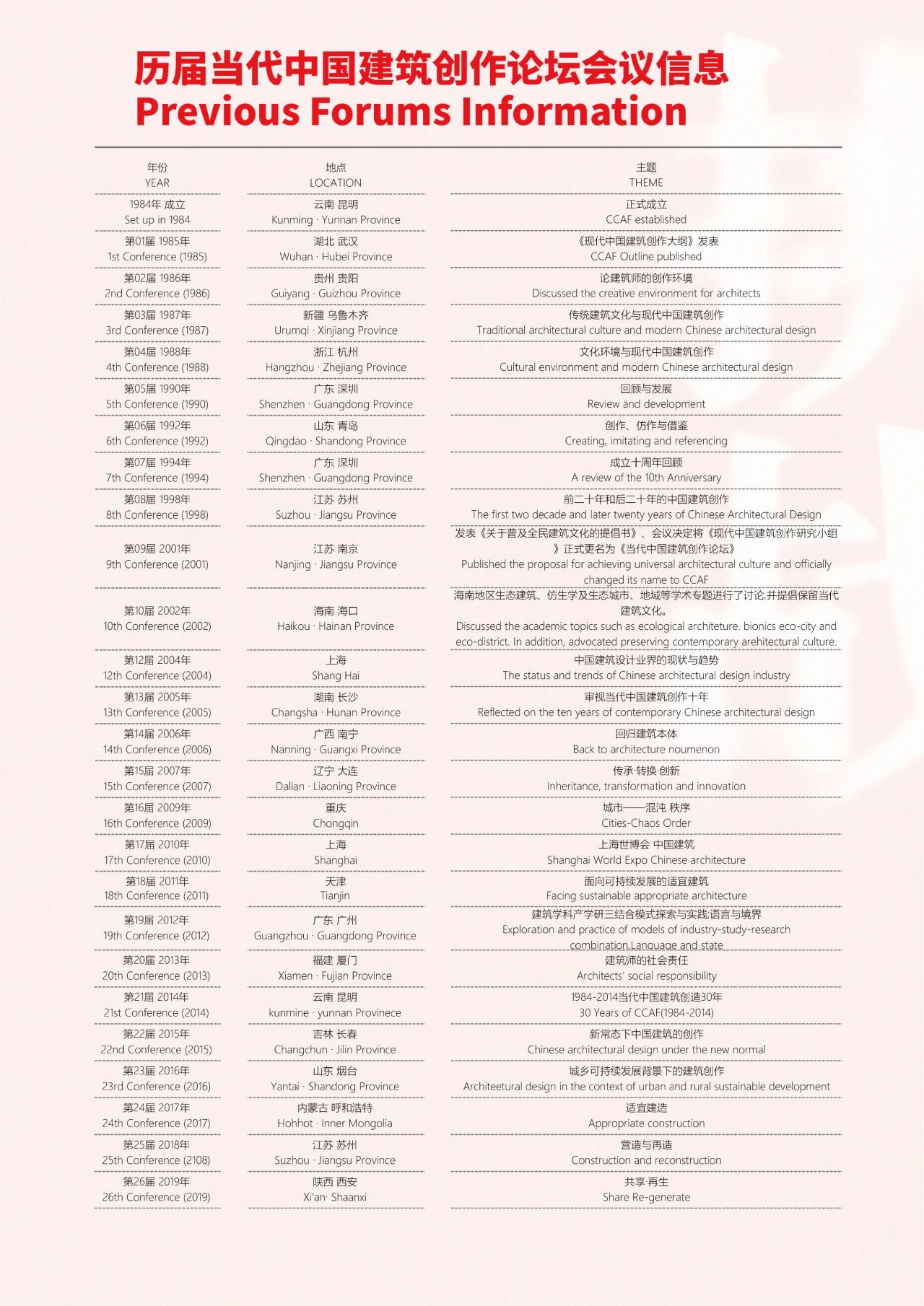 The Contemporary Chinese Architectural Creation Forum was established in 1984, its predecessor was the Modern Chinese Architectural Creation Research Group, which is the largest non-official architectural academic group in the country. Through the operation and practice of more than twenty sessions, it has promoted the prosperity of architectural creation in our country, enlivened the atmosphere of architectural creation, made positive contributions to the overall improvement of architectural creation in our country, and enjoys a good reputation and wide influence in the architectural world.