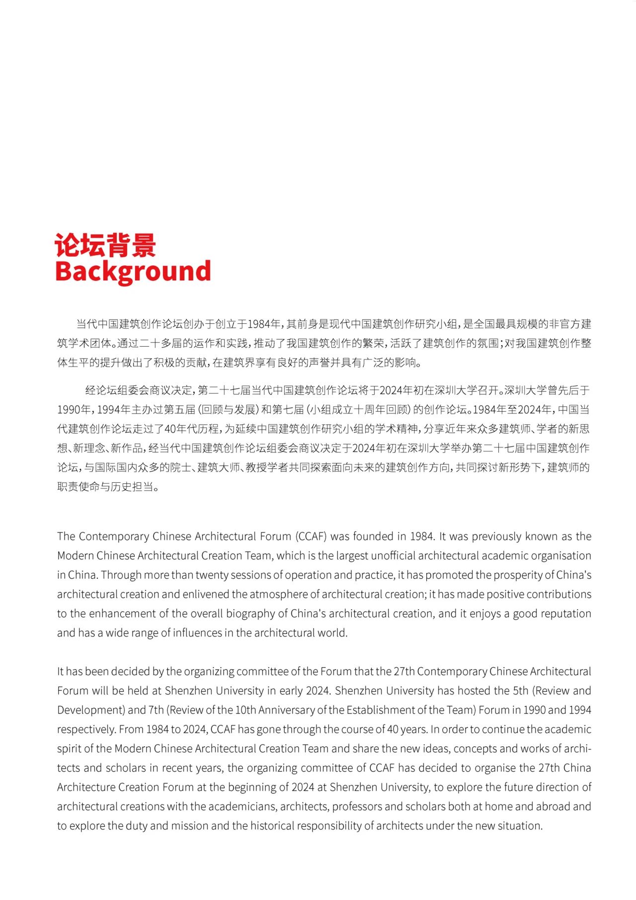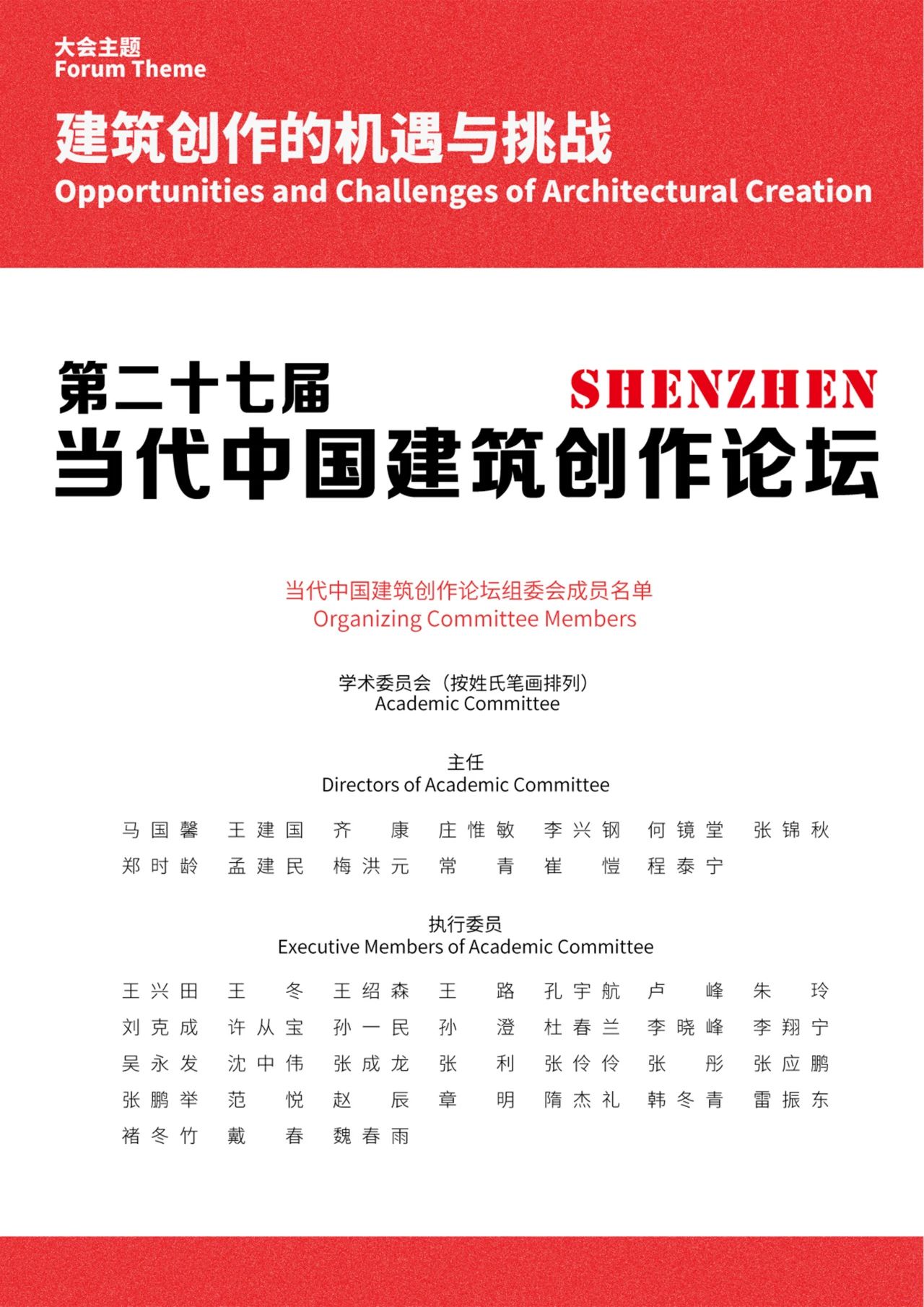 The Organizing Committee of the 27th Contemporary Chinese Architectural Creation Forum and the School of Architecture and Urban Planning at Shenzhen University cordially invite you to attend, and the conference agenda is released as follows. It includes the schedule of this forum, the list of guests, and other information.