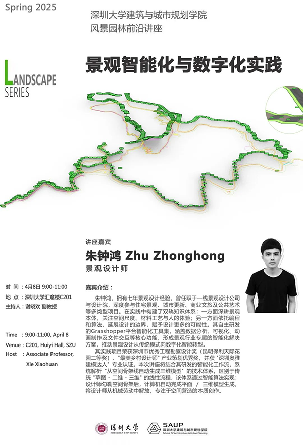 Zhu Zhonghong, with seven years of experience in landscape design, has worked for top landscape design firms and design institutes and has been deeply involved in various types of projects including residential landscapes, urban renewal, commercial tourism and public art. In practice, he has developed a dual-track knowledge system: on the one hand, he delves deeply into the essence of landscape, focusing on spatial scale, material craftsmanship and human experience; On the other hand, by relying on programming and algorithms, we extend the boundaries of design and give it more possibilities. Its self-developed Grasshopper platform intelligent toolset, which includes core functions such as data analysis, visualization, animation production and file interaction, forms an intelligent solution exclusive to the landscape industry, promoting the transformation of landscape design from traditional models to digital intelligence.