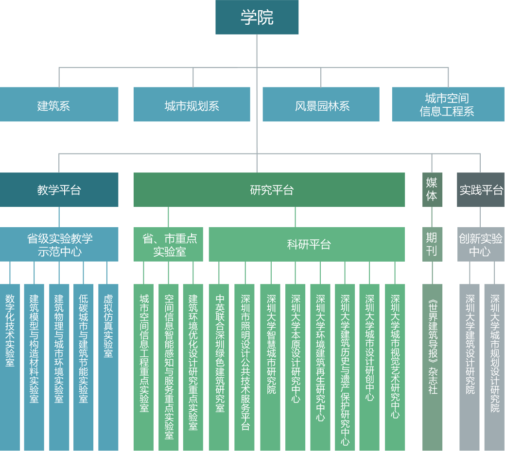首先,教学平台以省级实验教学示范中心牵头,下设建筑模型与构造实验室、建筑物理实验室、低碳城市与建筑节能实验室、城市空间信息技术实验室、景观环境生态实验室、造型艺术实验室、空间认知与设计虚拟仿真实验室等;其次,科研平台以广东省和深圳市重点实验室牵头,并包含校级各门类的科研机构。其中包含广东省城市空间信息工程重点实验室、深圳市空间信息智能感知与服务重点实验室、深圳市建筑环境优化设计研究重点实验室等科研机构,以及依托深圳大学本原设计研究中心、深圳大学智慧城市研究院等研究机构为学院师生提供良好的设计实践和研究创新的实验平台;再次,实践平台则依托学院的创新实验中心,下设拥有双甲级资质的深圳大学建筑设计研究院、深圳大学城市规划与设计研究院;最后,学院以《世界建筑导报》杂志社为媒体平台,实现了更多高层次的国际学术交流。