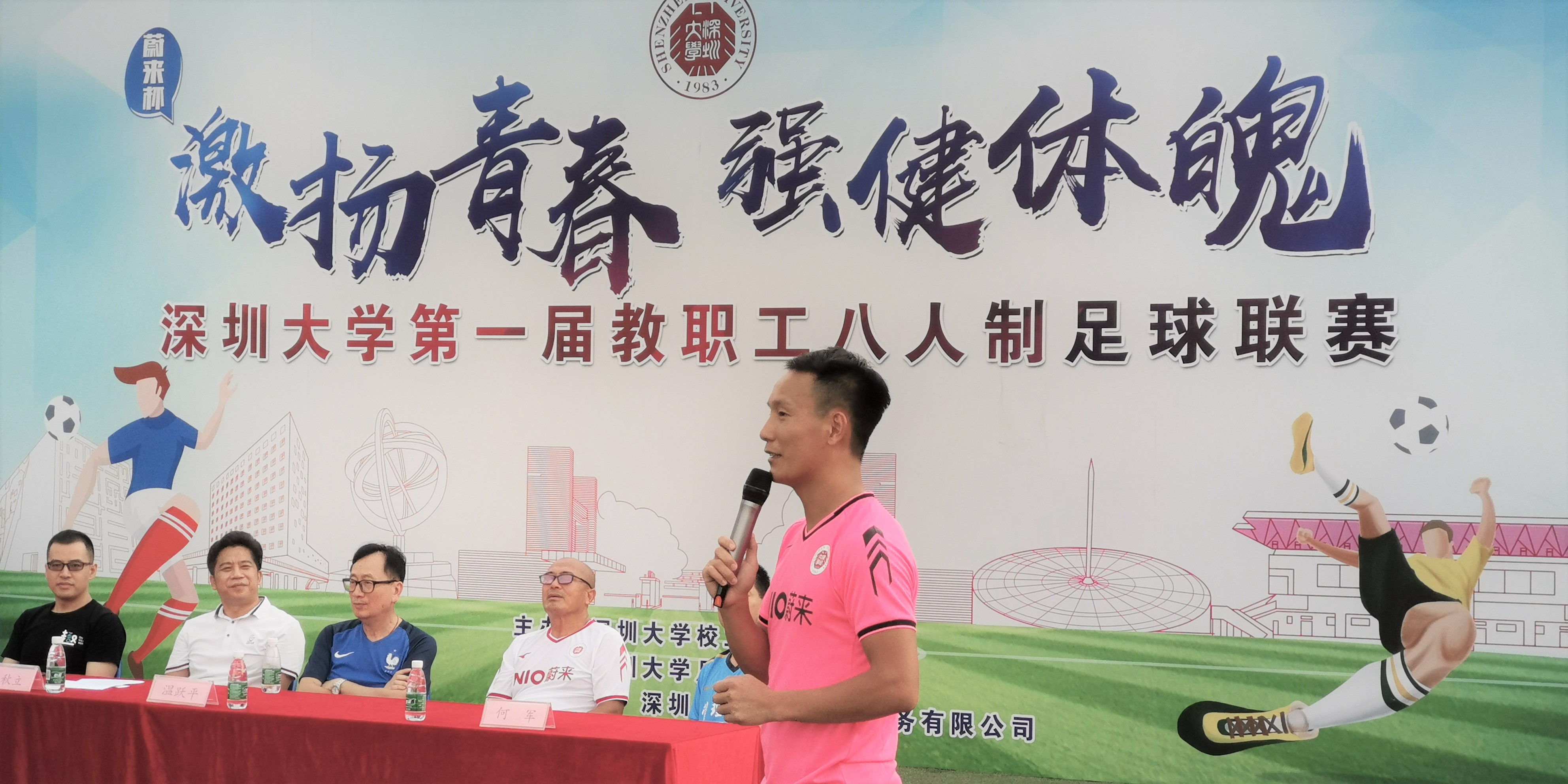 为了丰富广大教职工业余文化生活,贯彻《深圳大学文化发展纲要》,增强教职工团队的凝聚力,打造具有深圳大学特色的体育文化名片,由深圳大学校工会主办、深圳大学足球协会协办,深圳大学首届“教职工八人制足球联赛”于2019年10月13日开赛。下午四点,在运动广场二楼足球场举行了隆重的开幕式。参赛队伍包括粤海教工联队、沧海教工联队、丽湖教工联队、保卫部、物理与光电学院、机电学院、土木学院、管理学院、深大总医院、建规学院以及赞助方蔚来汽车。