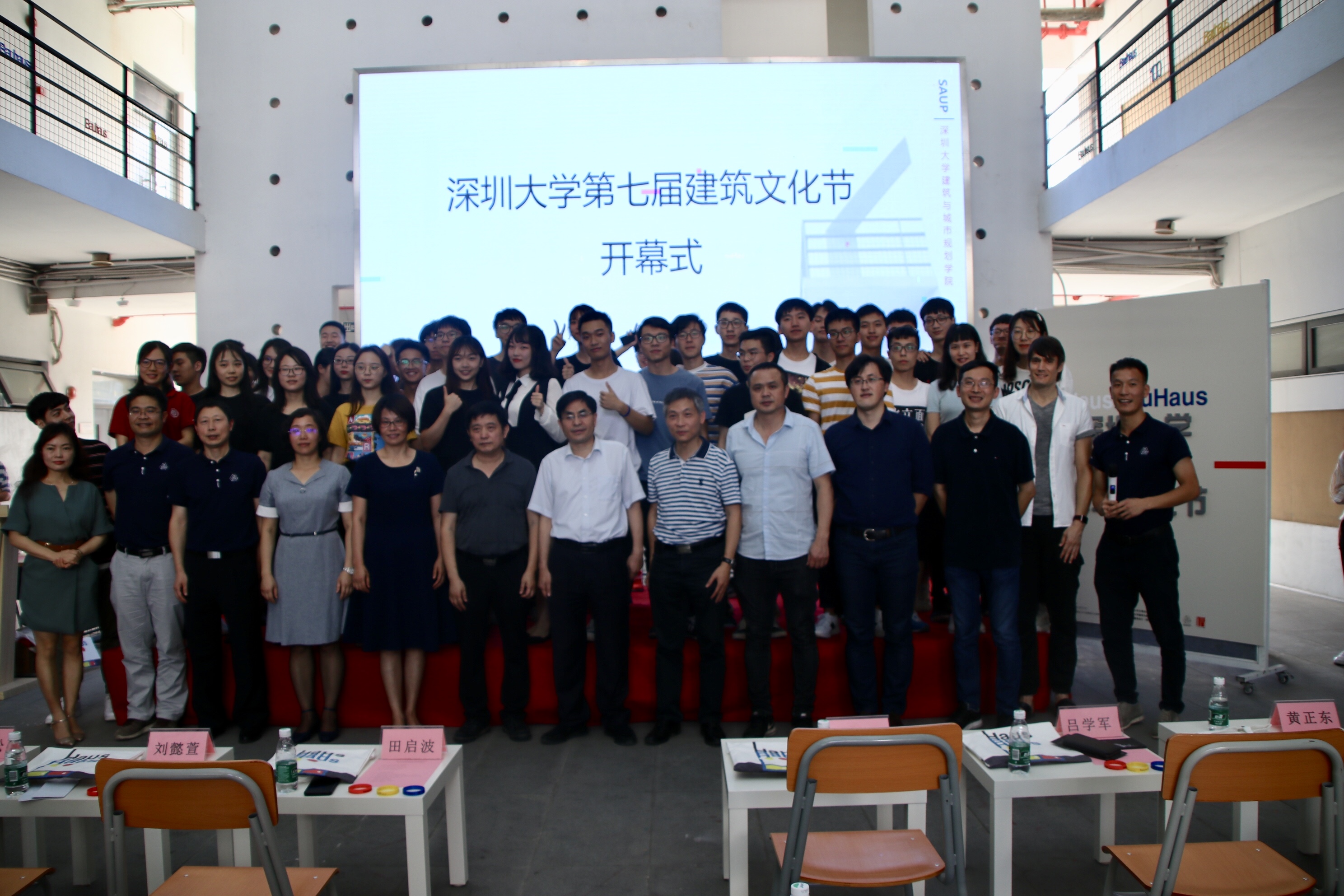 5月14日下午4点,2019第十五届文博会深大文化创意园分会场系列活动之深圳大学第七届建筑文化节开幕式在建筑与城市规划学院院馆二楼中庭隆重举行。深圳大学社科部主任、深大文博会管委会办公室主任田启波教授,深圳大学建筑与城市规划学院党委书记钟波涛老师,柏涛建筑设计有限公司董事、总建筑师、前海柏涛总经理吕学军先生,深圳大学社科部副主任刘懿萱老师,安全保卫部副主任康上荣老师,后勤部副主任林丹凤老师,建筑与城市规划学院副院长黄正东老师,副院长彭小松老师,副院长杨晓春老师,副院长齐奕老师,副书记冯俊艳老师以及院长助理赵阳老师共同出席开幕式。同时参加开幕式还有建筑与城市规划学院师生100余人。