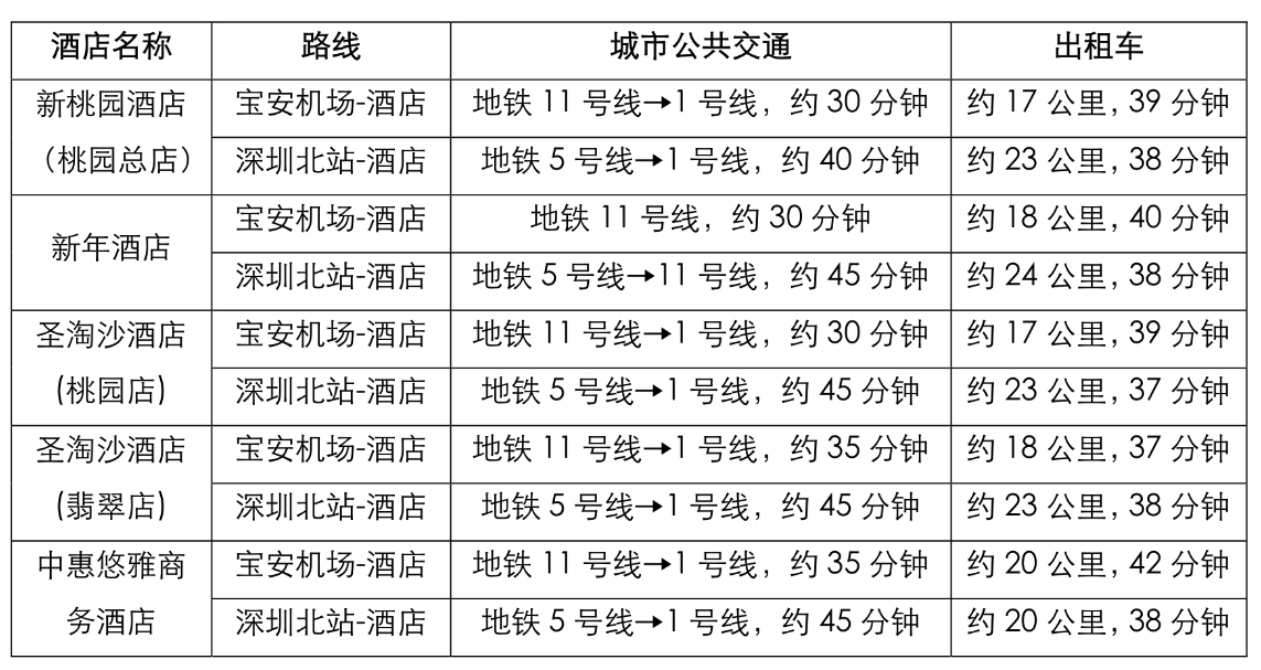 由于12月深圳会议较多,房源非常紧张,组委会特联系了5家酒店供参会者选择,请参会者尽早预定酒店,以便顺利入住。办理入住时可联系酒店说明参加深圳大学建筑与城市规划学院组织的12月15日建筑学学科建设研讨会,可享受协议价。具体酒店信息如下: