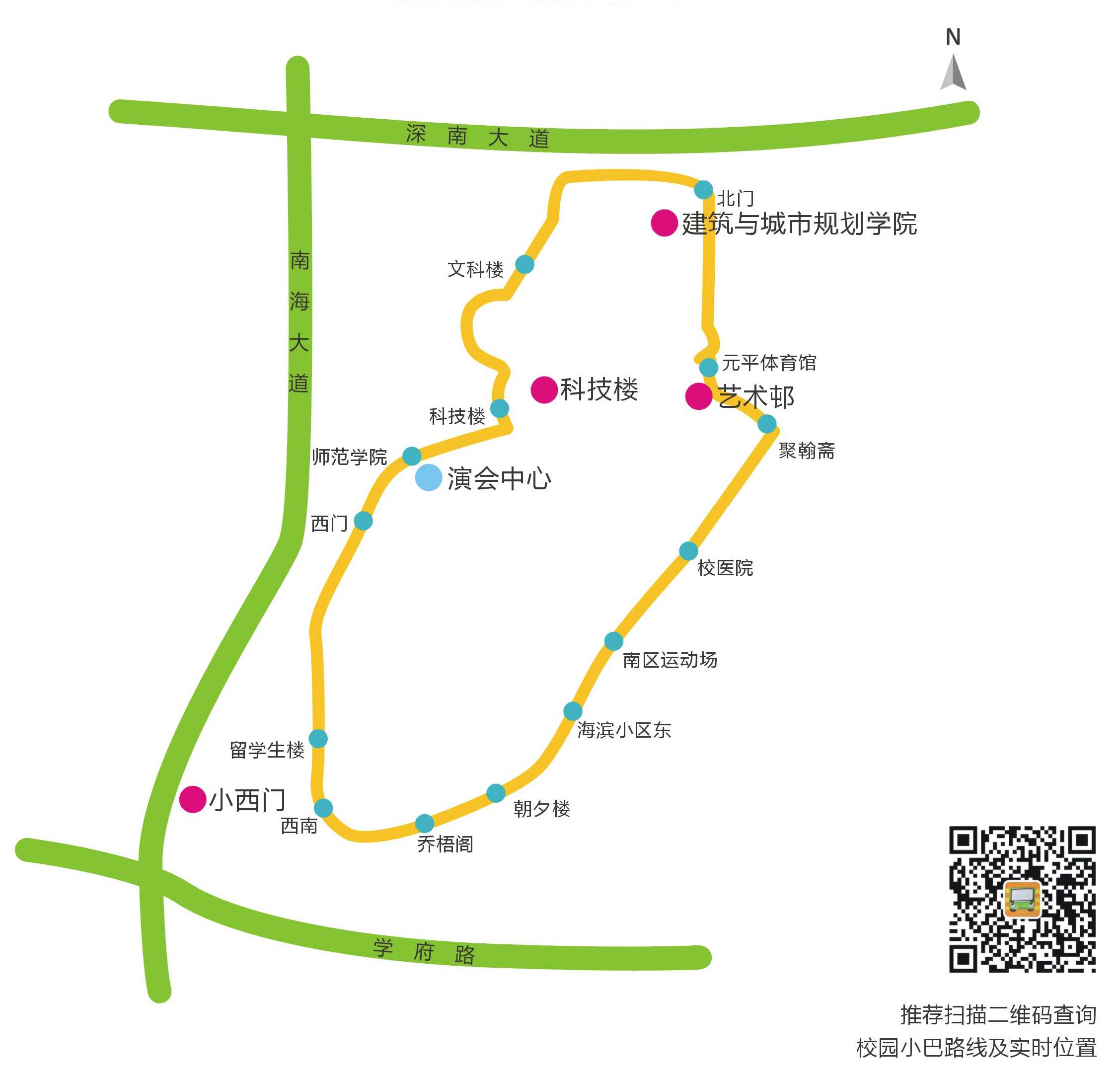 会议期间参观校园推荐步行或乘坐校园内荔园小巴(车费1元),扫描下图中二维码即可随时查询小巴路线及实时位置。