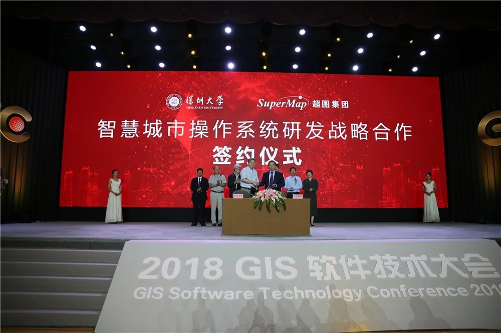 8月29日,2018 GIS 软件技术大会在北京国际会议中心盛大开幕。深圳大学智慧城市研究院院长郭仁忠院士在大会上做了题为“操作系统:智慧城市的GIS担当”的主题报告;报告结束后,深圳大学校长李清泉与超图集团董事长钟耳顺现场签订战略合作协议。