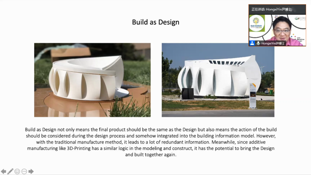 仪式环节结束后,特邀嘉宾圣路易斯大学副教授、SDC-2013赛场总指挥及SDC-2018顾问委员会秘书长尹鸿玺博士做了题为“From Washington to Beijing Winter Olympics- A decathlon lasts for two decades”的主题讲座。讲座中尹老师首先介绍了太阳能十项全能竞赛在全球及中国的发展历程,并回顾了往届优秀作品。而后,尹老师详细分享了两个自己亲自带队参加所完成的作品:砼屋与莲屋。砼屋探讨了以混凝土作为建筑单一材料的可能性,莲屋则对低成本的定制化建筑构件进行了深入研究,两个项目各具特色,创新性十足。最后,尹老师提出了信息供应链创新将是未来建筑发展要点的观点,并对建筑教育的发展进行了畅想。