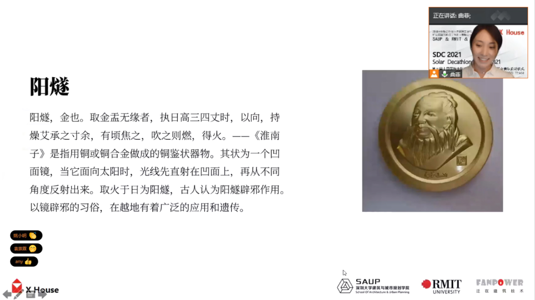 本次大会也为线上的嘉宾同学准备了彩蛋环节,拿出沈辉教授带来的一块阳燧铜镜作为礼物,通过弹幕互动截屏的方式赠与一名幸运的同学。阳燧有很好的寓意,古人照日取火,取火于自然,阳燧虽小,却是结合了太阳的恩赐和人类的智慧,这正好与太阳能竞赛的理念不谋而合。也希望这枚阳燧可以点燃同学们对太阳能建筑的热情!