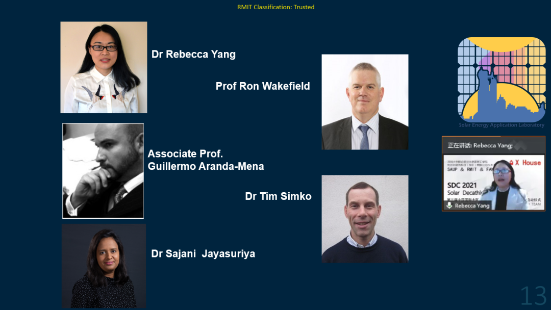 导师团副团长,墨尔本皇家理工大学(RMIT)光伏应用实验室主任、国际能源署建筑光伏一体化澳洲专家Rebecca Yang向大家亲切地介绍了澳方团队的贡献。RMIT的队员均来自于太阳能应用实验室(Solar Energy Application Laboratory,SEAL),其多层次的研究人员构成以及在BIPV集成设计和区块链整合方面的研究优势将为联队贡献强大的力量。