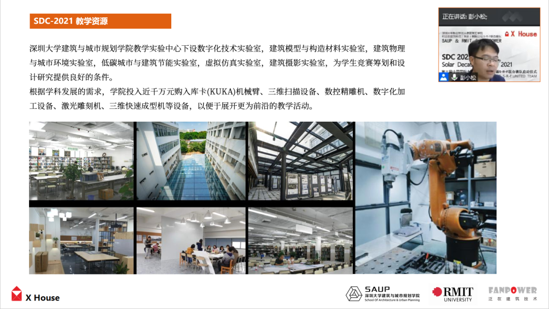 随后,导师团副团长、深圳大学建筑与城市规划学院副院长彭小松老师介绍了深圳大学的教学资源及对赛事培训辅导的精心安排。彭院长揭晓了顾问团和导师团的强大阵容,包括刘晓都、尹鸿玺、沈辉、仲继寿、袁磊、朱竞翔、刘珩、王志东、钱华、葛文俊、罗多、郝斌、梁书龙、吴云来等资深的学者专家作为顾问,也包含来自SAUP-SZU和RMIT的在建筑设计、能源技术、智能建筑和区块链等领域的16位老师。顾问和导师团的揭晓迎来线上不断刷屏的点赞和弹幕热潮。