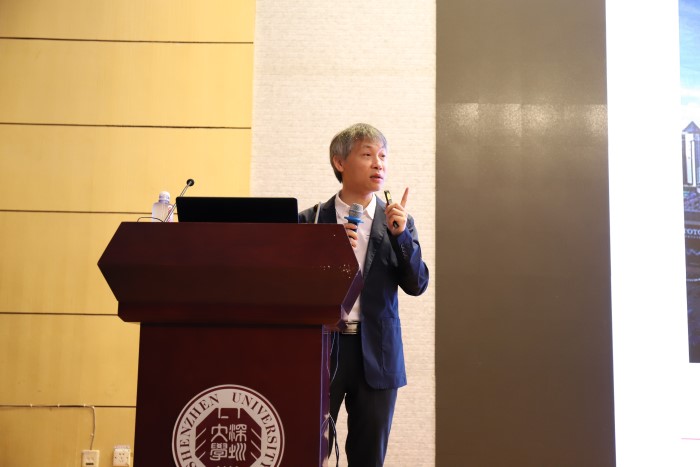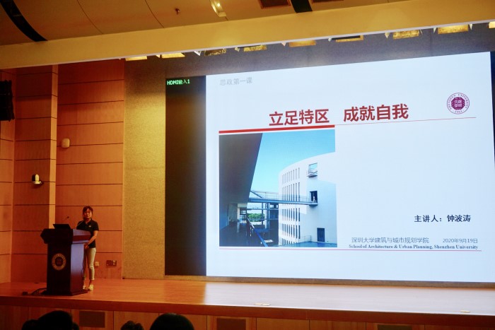 钟波涛书记首先向生机勃勃、精神饱满的2020级新生表示热烈欢迎,他回顾20年前自己在深大的求学史,表示同学们加入深大的选择是明智和幸运的。接下来钟书记从我们的城市、我们的大学、我们的学院、青春的我们四部分内容开始今天的课程。