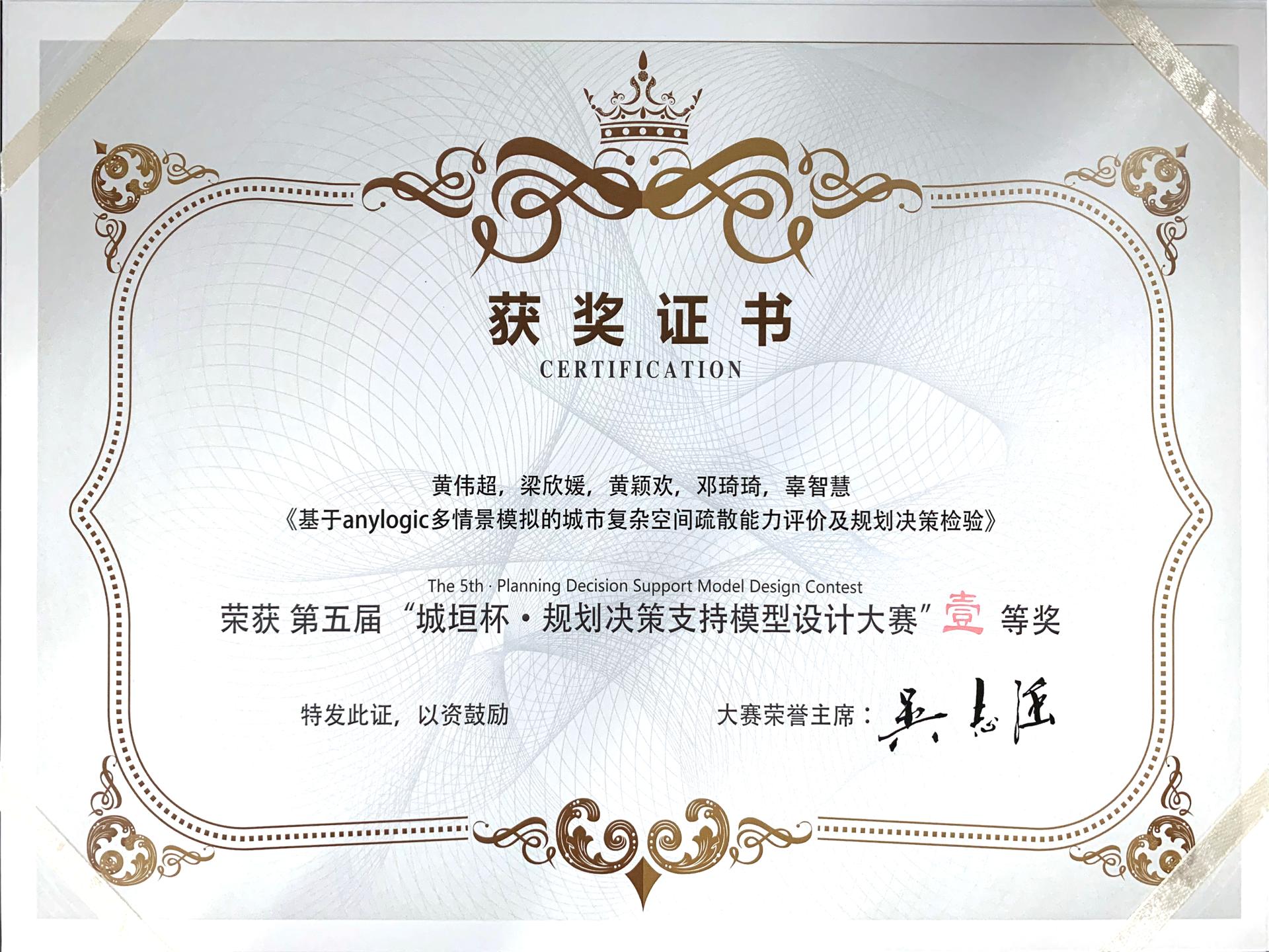 终评⼤会上,⼤赛荣誉主席吴志强院⼠以视频形式致辞,北京市城市规划设计研究院⽯晓冬院⻓、王引总规划师致欢迎辞。来⾃国内城市量化研究及相关领域的15位⾏业权威专家组成终评专家组,对19个终评⼊围参赛团队开展评选。⼤赛”共产⽣特等奖两名,⼀等奖五名,⼆等奖⼗⼆ 名。深圳⼤学建筑与城市规划学院辜智慧⽼师指导带队的团队“基于anylogic多情景模拟的城市复杂空间疏散能⼒评价 及规划决策检验”取得全国⼀等奖成绩。
