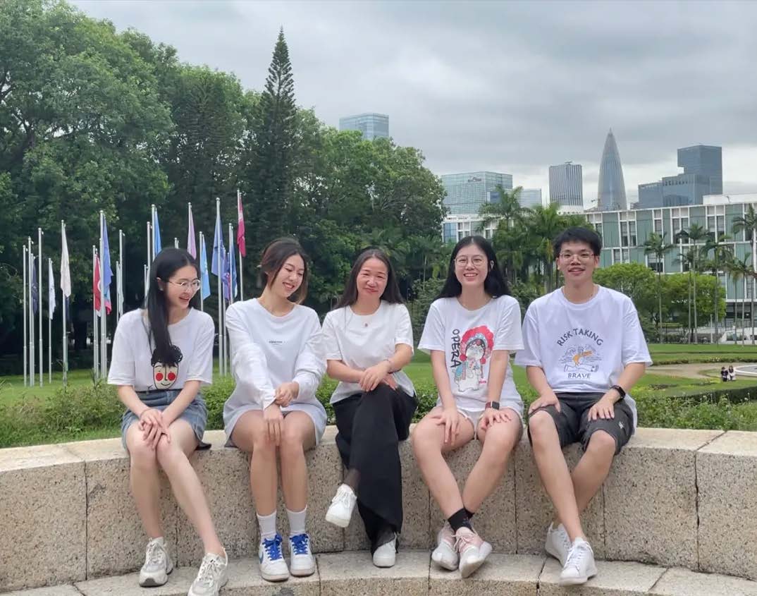 团队成员邓琦琦、梁欣媛、辜智慧(指导⽼师)、⻩颖欢、⻩伟超(从左到右)