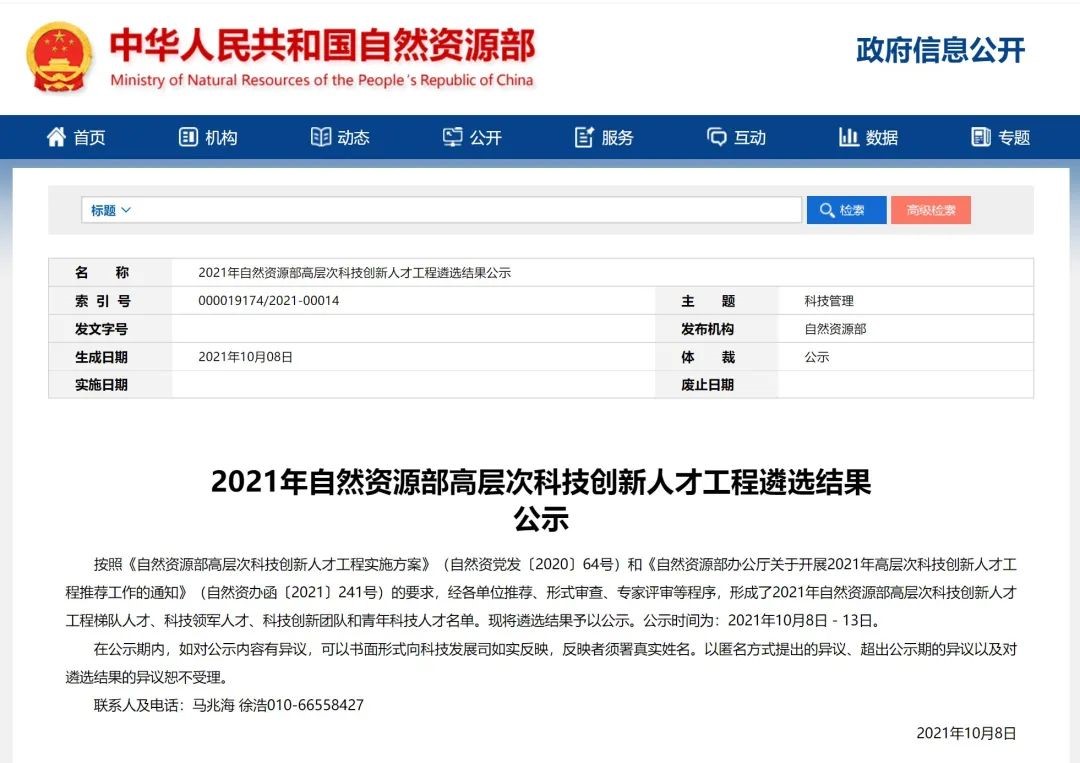 2020年12月31日,自然资源部党组印发《自然资源部高层次科技创新人才工程实施方案》,标志着自然资源部高层次科技创新人才工程正式启动。科技人才工程旨在围绕履行自然资源“两统一”等职责使命要求,激发人才创新活力,增强科技创新竞争力,有计划地发现、激励一批在自然资源重大基础研究、技术研发和重大工程实施等方面创新能力强、业绩突出的高层次创新人才,优选发展潜力大的科技人才重点培养,建立科学的人才评价标准,拓宽高层次创新人才的成长通道,不断壮大自然资源科技科技创新人才队伍。