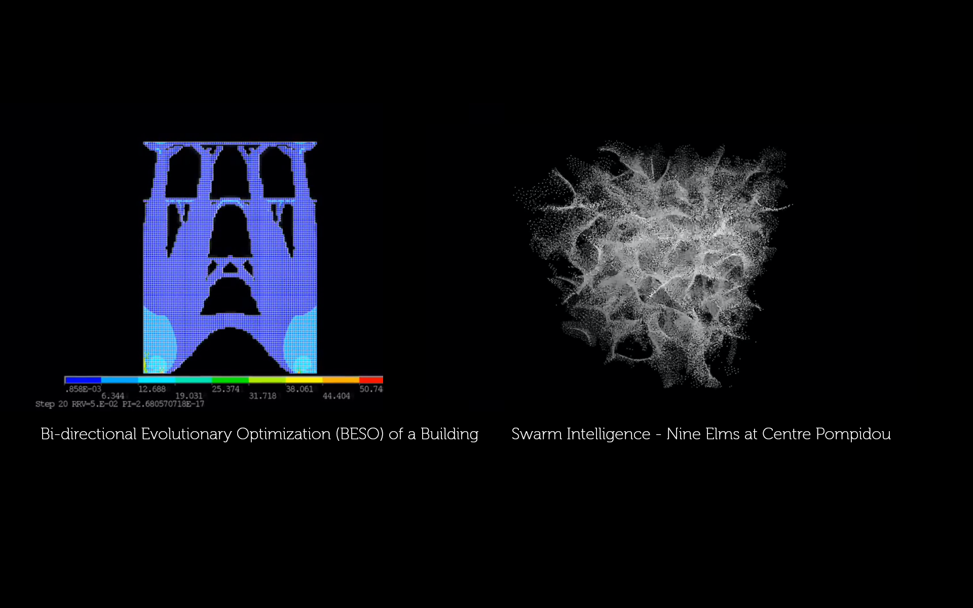 讲者围绕他在皇家墨尔本理工大学的研究项目和设计教学成果展开,基于创造新的的算法进行有效性的复杂形态生成。如利用拓扑优化算法、Ameba软件,模拟自然树木和高迪设计的柱子,生成树状结构装置,利用机械臂和3D打印建造各种比例的模型,并在模具设计上进行了大量探索。此外,通过集群智能算法等方式,探索混凝土、粘土、金属、聚合物等材料的找形方法并设计高度复杂的建筑形态。同时还利用原型样品、结构性能测试、数字建造和机械臂3D打印等作为主要建造工具,探索并开发创新的混合式建造方法,从根本上改变高复杂性建筑构造几何的可行性。