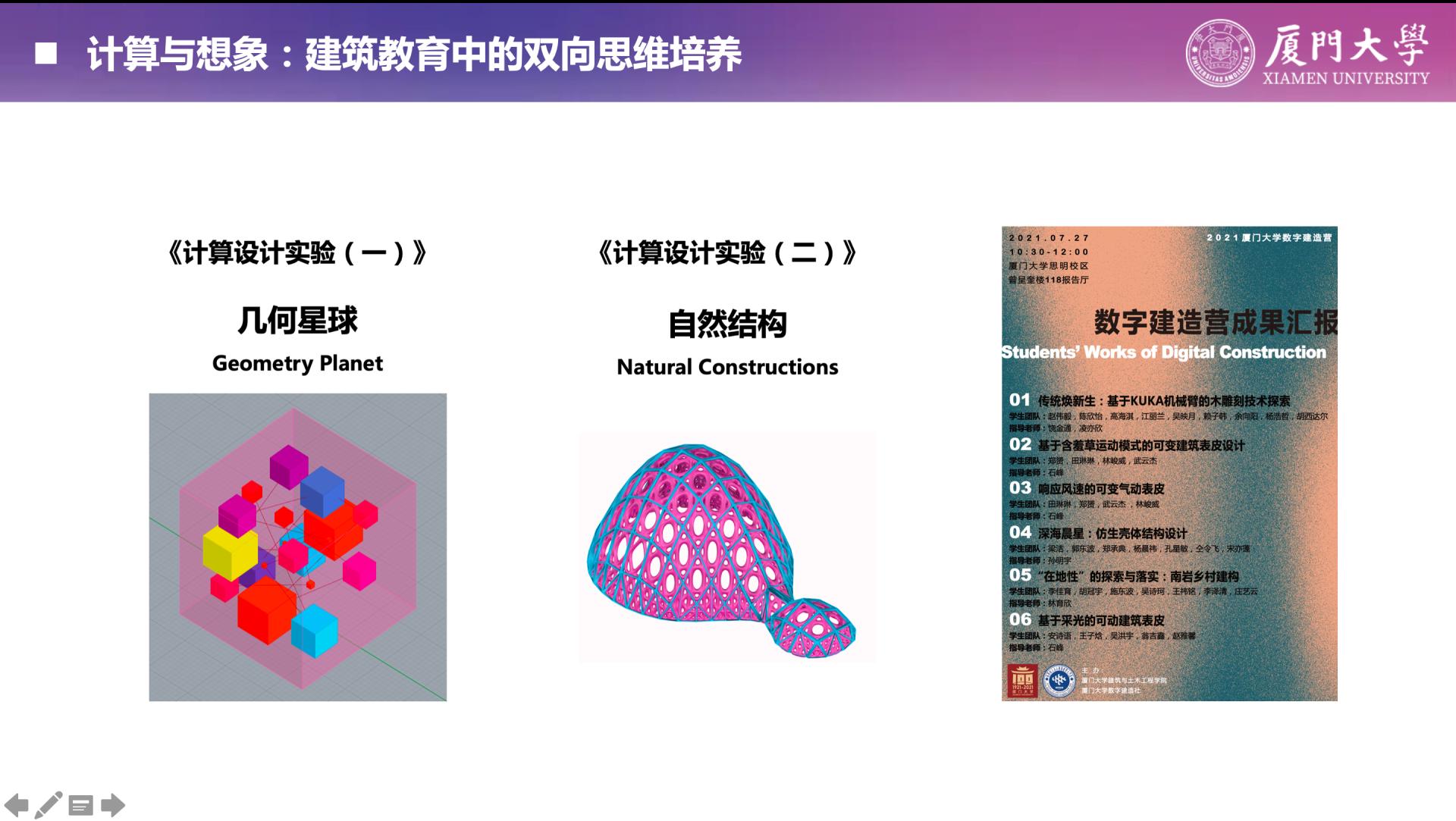 基于建筑教育的综合性视角,详细讲解了计算与想象之间的区别与联系。从人工智能未来与新工科人才思维的思考出发,提出新工科背景下的未来建筑师应该具备计算性与创造性的双向思维。通过厦门大学《计算设计实验》系列课程的开设,分别以“几何星球”、“仿生壳体”为主题,进行了计算性设计与建筑基础教育相结合的探索性教学实践,思考了未来建筑教育中“计算”和“想象”双向思维培养的策略与方法。