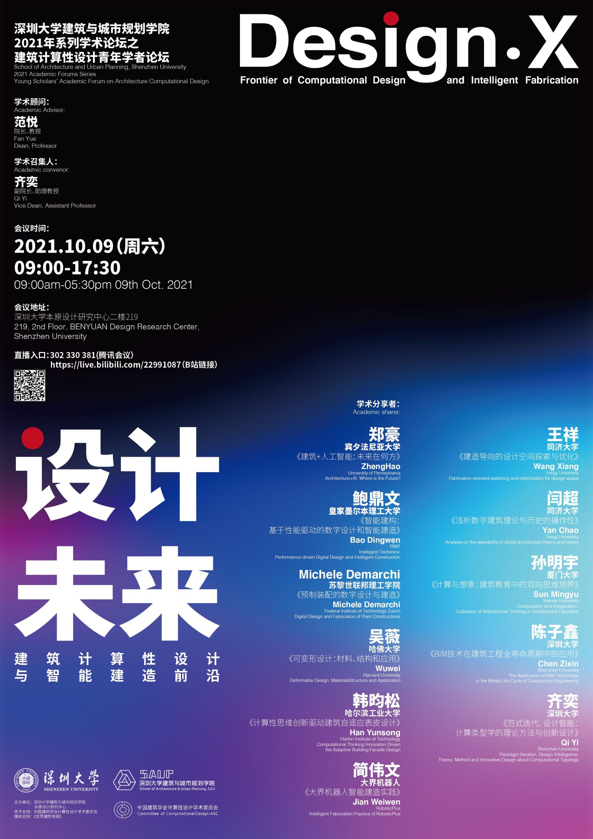2021年10月9日,深圳大学建筑与城市规划学院2021年系列学术论坛之建筑计算性设计青年学者论坛在深圳大学本原研究中心219成功举办。论坛由深圳大学建筑与城市规划学院主办,本原设计研究中心协办,中国建筑学会计算性设计学术委员会提供学术支持。范悦教授担任此次学术顾问,齐奕助理教授作为学术召集人进行了此次论坛的策划与组织。