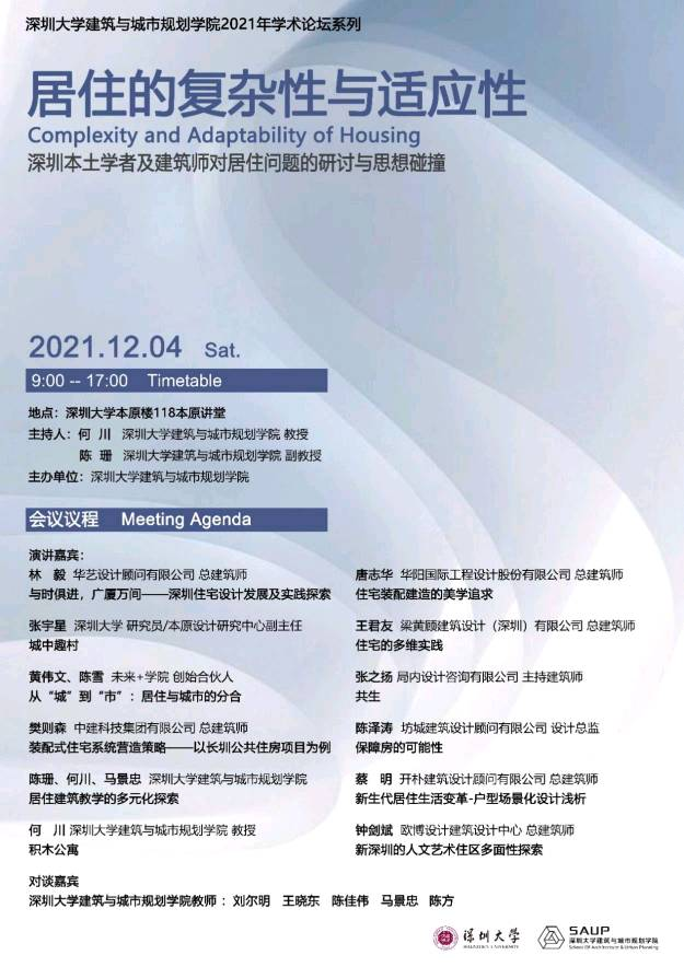 2021年12月4日,深圳大学建筑与城市规划学院2021年系列学术会议 | 居住的复杂性与适应性研讨会在深圳大学本原楼118本原讲堂成功举办。本次研讨会由深圳大学建筑与城市规划学院主办,由学院的建设建筑学一级学科博士点项目资助,学术召集人为何川教授。