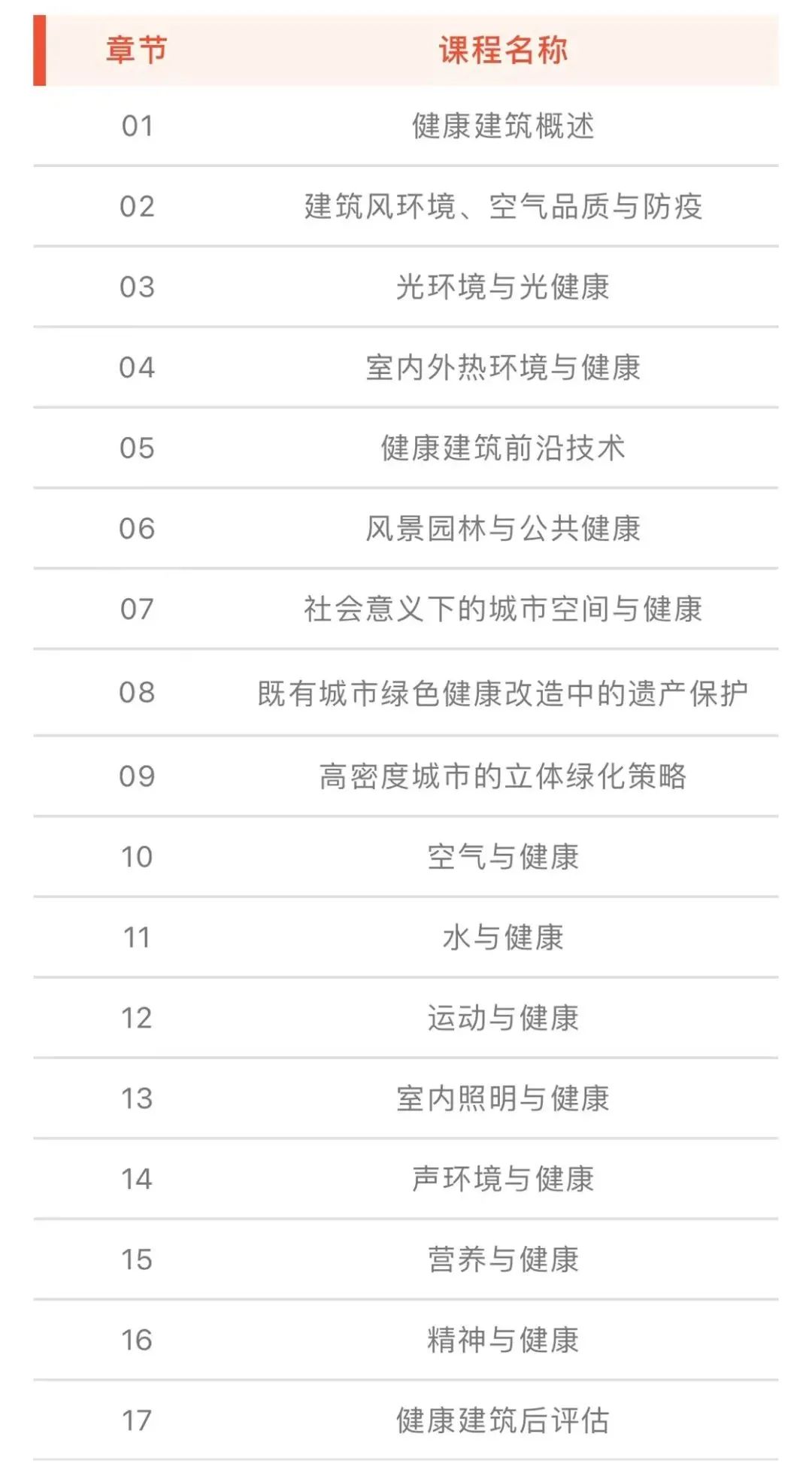 本次《健康建筑概论》课程主要包含两大部分,共 17 章 64 节。