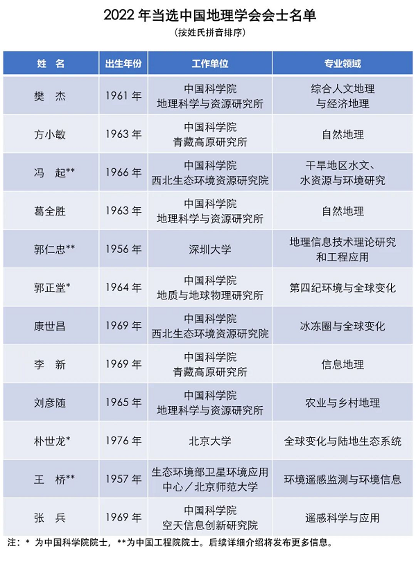 中国地理学会会士是中国地理学会设立的地理科学领域的最高学术荣誉称号,分为会士和荣誉会士,为终身荣誉。在地理科学领域取得重大突破的学会会员或为中国地理科学做出突出贡献的科学家,可被推荐并当选为中国地理学会会士;对年满80周岁的学会会士或为学会发展作出重大贡献的学会会员以及国际友人可授予中国地理学会荣誉会士。此次增选工作共评选出包括两院院士在内的12位中国地理学会会士,3位外籍会士,以及2位外籍荣誉会士。