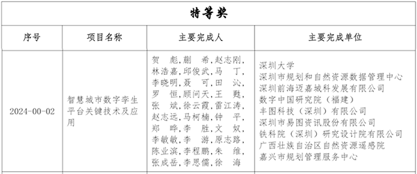 2024地理信息科技进步奖评选结果正式揭晓,由深圳大学建筑与城市规划学院郭仁忠院士团队贺彪副教授牵头,深圳市规划和自然资源数据管理中心(深圳市空间地理信息中心)、深圳前海迈嘉城科发展有限公司等单位共同完成的“智慧城市数字孪生平台关键技术及应用”项目荣获2024地理信息科技进步特等奖。