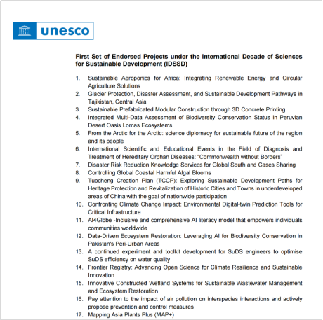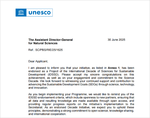 “科学十年(IDSSD)”由联合国大会于2023年8月正式设立,并由联合国教科文组织牵头实施,是一项面向全球的科学倡议,旨在以科学促进全球协作,加速实现可持续发展目标。“科学十年(IDSSD)”倡导基础科学、应用科学、社会科学与人文科学的交叉融合,推动社会、经济与环境的积极转型,构建人人可参与、可受益的科学文化。其核心使命是动员全社会力量,确保科学服务于全人类的共同福祉。为落实该倡议,联合国教科文组织(UNESCO)于2023年10月正式启动“科学十年(IDSSD)”项目征集工作。经过全球范围的严格遴选,最终包括本项目在内的第一批共57个项目(Projects)入选“科学十年(IDSSD)”首批认可项目清单。