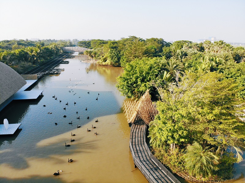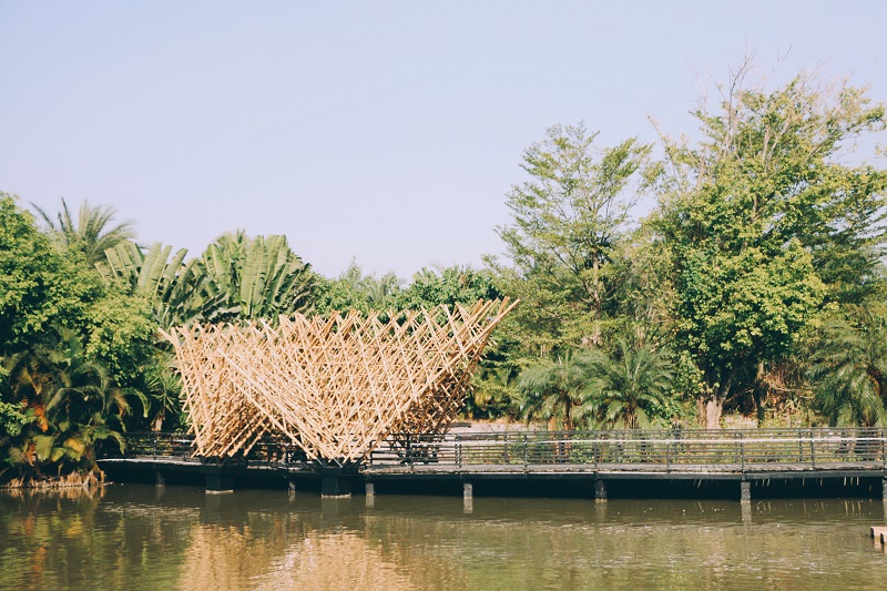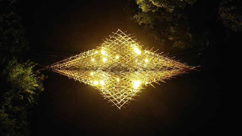 人们常常用竹子营造轻盈的感觉,而往往忽略竹子的厚重感,我们放弃了常规的编织等方法,想利用线性的构件来产生体积,形成具有力量的空间。表皮的空间深度可以遮阳但通风效果较好,适应了岭南气候。形态上保证了竹廊作为通行的功能,并增加了停留和观景层次,竹子的大量重复形成了类似于鸟类羽毛的蓬松效果。最终的效果脱离了人们对竹子的固有的印象,丰富了竹子在空间上的表现力。