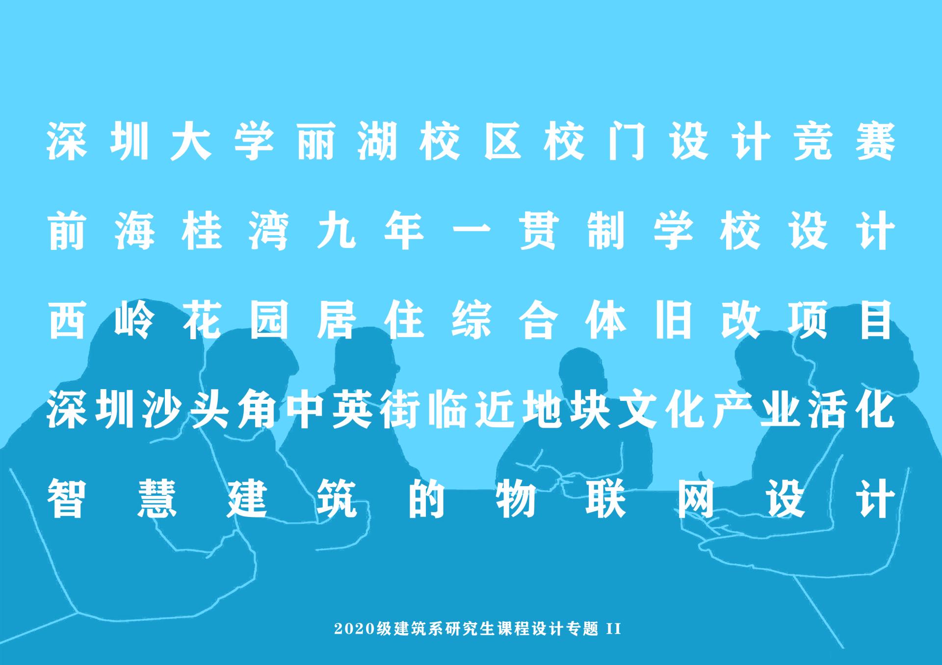 本次设计课题方向包括前海桂湾九年一贯制学校设计、西岭花园居住综合体旧改项目、深圳沙头角中英街临近地块文化产业活化、智慧建筑的物联网设计四个专硕课题。课程将继续围绕公共建筑、居住建筑以及既有建筑保护等设计研究方向,以研究方向相近、规模适中为原则,建立配套课程设计课题教师组,对学生进行节点式集中评图辅导。具体课程节点包括:课题解析、过程中期交流、终期集中评图答辩等环节。研究生选题原则,可以本人所选研究方向为主,同时鼓励在不同研究方向作选择尝试。学生分组原则上以3~4人为限。
