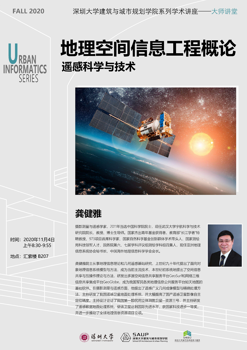 该课程承担着培养学生专业兴趣,引导后续学习方向的责任,因此在内容安排上,结合学科历史和前沿地理空间信息工程的科研成果进行讲授,让学生可以对学科全局有全面准确的了解。在师资配备上,授课老师包括中国工程院院士郭仁忠教授、魏子卿教授,欧亚科学院院士、深圳大学校长李清泉教授等,并邀请到领域的其他的院士和学者客座讲授。