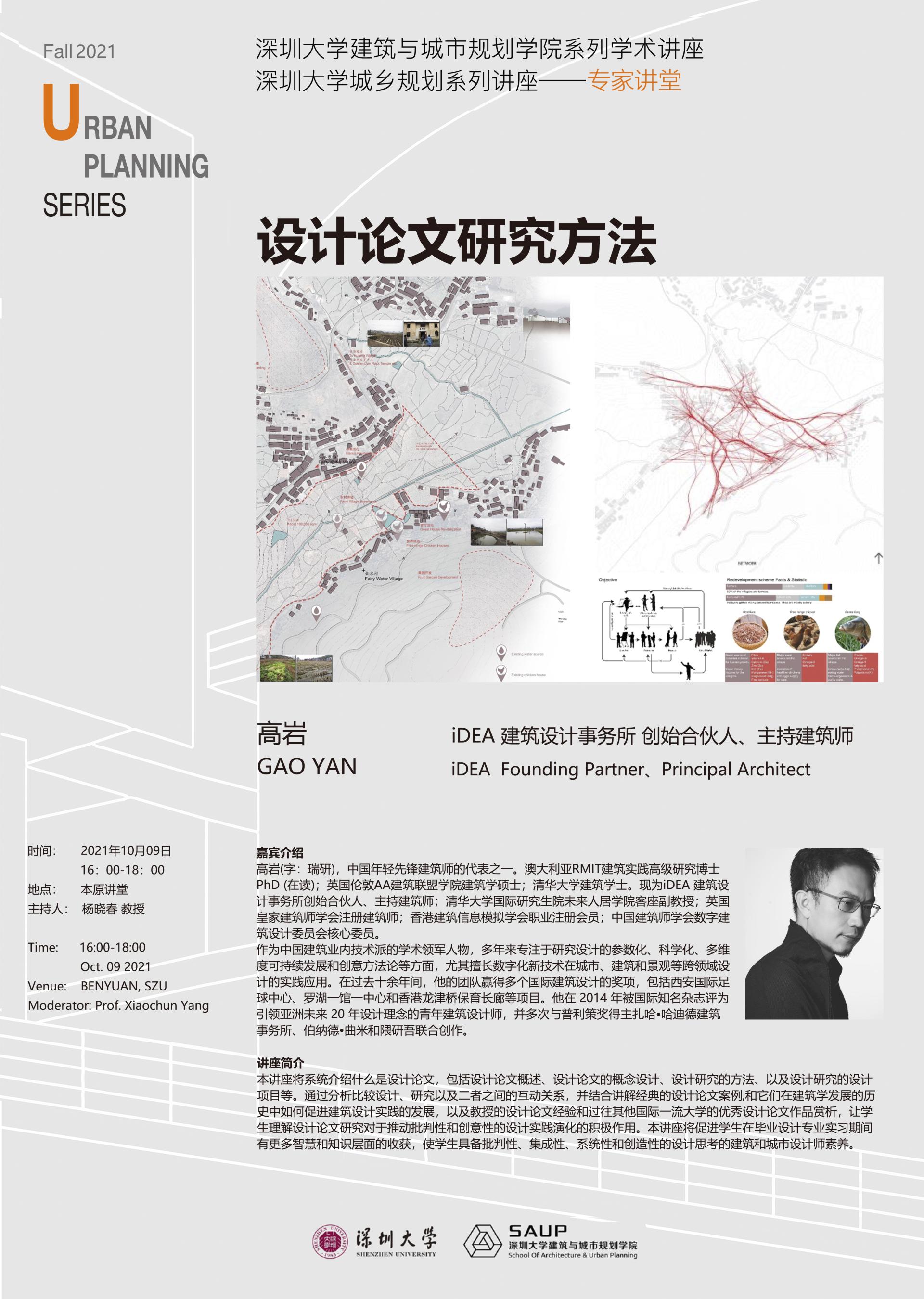 本讲座将系统介绍什么是设计论文,包括设计论文概述、设计论文的概念设计、设计研究的方法、以及设计研究的设计项目等。通过分析比较设计、研究以及二者之间的互动关系,并结合讲解经典的设计论文案例,和它们在建筑学发展的历史中如何促进建筑设计实践的发展,以及教授的设计论文经验和过往其他国际一流大学的优秀设计论文作品赏析,让学生理解设计论文研究对于推动批判性和创意性的设计实践演化的积极作用。本讲座将促进学生在毕业设计专业实习期间有更多智慧和知识层面的收获,使学生具备批判性、集成性、系统性和创造性的设计思考的建筑和城市设计师素养。
