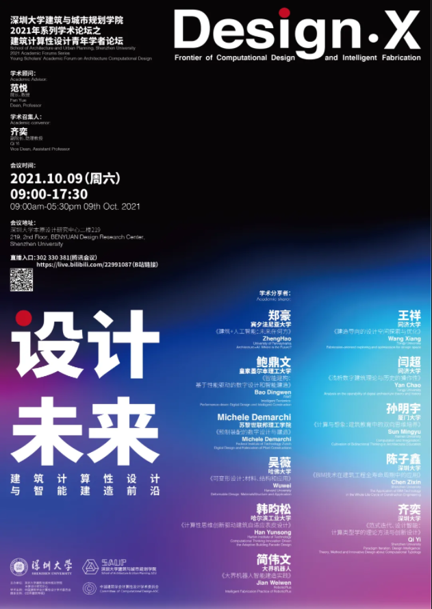 AI、数字孪生、机器人、扩展现实(XR)等新兴技术为建筑科技创新带来了无限可能。随着计算性设计与智能建造的新理念、新方法、新技术不断涌现,设计、制造、建造正在相互渗透并融合,学科范式与边界也在不断更新。本体何为,边界何为,交叉何为?本次青年学术研讨会邀请到11位国内外青年学者,旨在通过分享各自在研究、教学、实践方面的最新思考,为计算性设计与智能建造贡献青年智慧。青年学者们将共同探讨Design中的X因素,携手创享“设计·未来”。