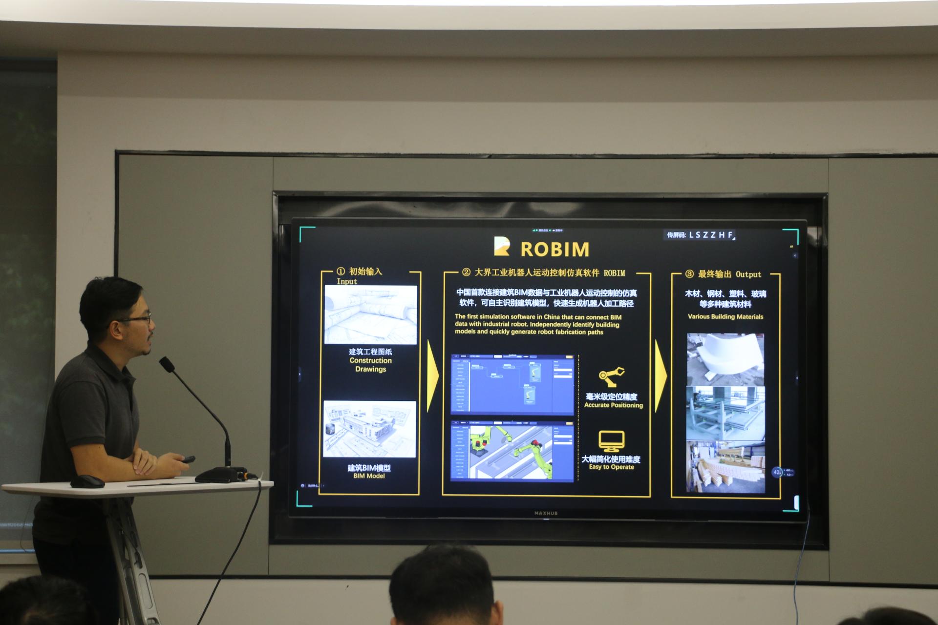 大界机器人关注建造机器人对于智能建造的助力, 致力于建筑项目、制造工厂以及智能建造端一体化运行的建筑工业化生产云平台研究与实践。作为智能建造方案提供商,提出了建造智能化、柔性化、数字化的建筑科技解决方案。讲者详细介绍了中国首款连接建筑BIM数据与工业机器人运动控制的仿真软件ROBIM,同时用精彩的视频呈现了公司丰富的智能建造实践案例(中国土家族泛博物馆彭家寨游客中心/松阳文曲童书馆/南京园博园胶合木吊顶等),最后还分享了大界最新的智能建造研究产品——可快速运输的“胶囊工厂”,为移动式便捷建造提供了一种全新的技术解决方案。