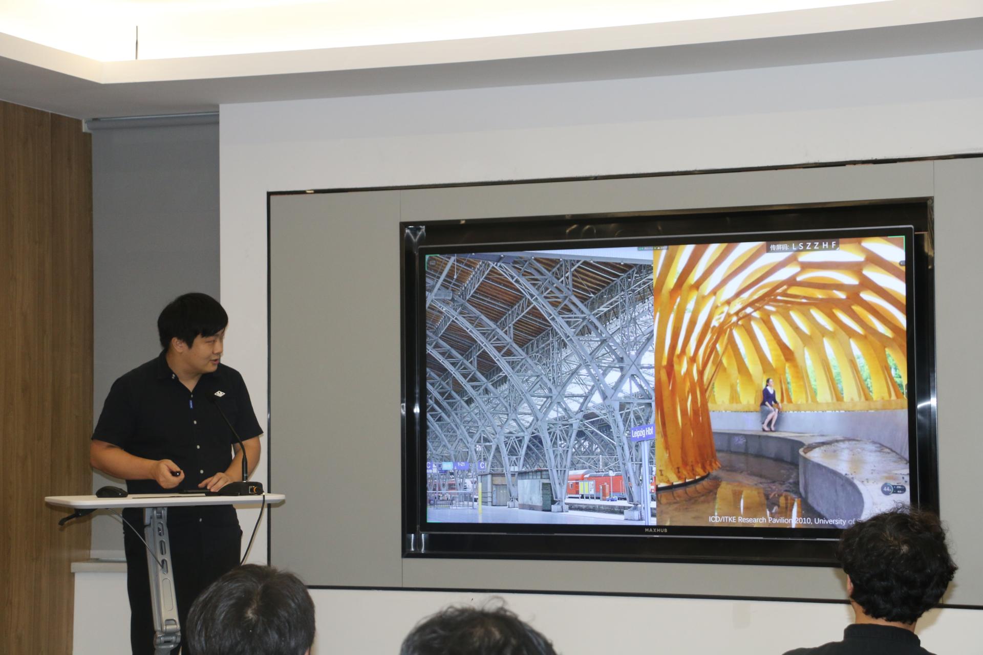 讲者主要讨论了在计算性数字设计和智能建造技术推动下,以建造为导向的建筑设计思想和相关的优化设计方法。在结构、几何、工艺三者对设计空间限定的条件下,将结构性能化设计、结构优化技术、建筑几何学和机器人智能建造技术整合,从工艺、效率等角度为建筑设计提供了丰富的求解空间和形式可能,以此寻求设计空间的创新与突破。本次分享以大量丰富的数字建造案例为对象,展示一系列相关的针对设计空间探索的研究内容和以新型工艺为代表的数字建造技术。