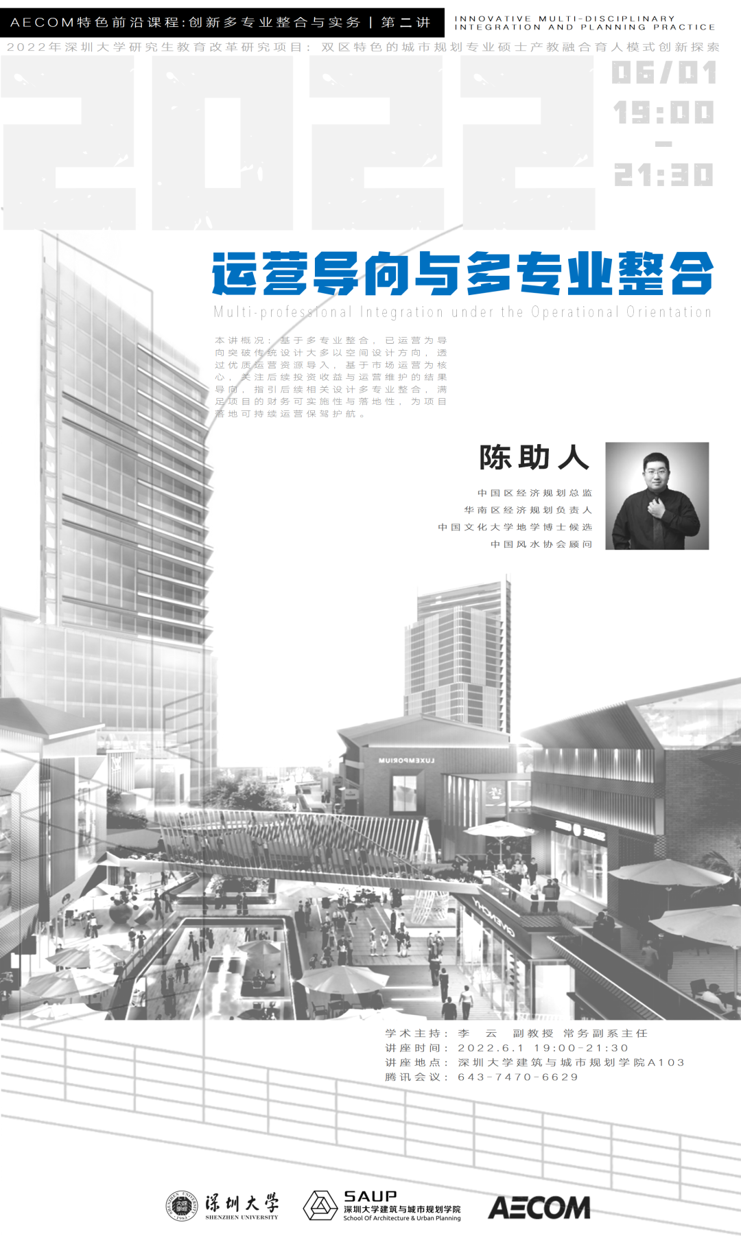 “创新多专业整合与实务(INNOVATIVE MULTI-DISCIPLINARY INTEGRATION AND PLANNING PRACTICE)” 课程是2022年深圳大学研究生教育改革研究项目(双区特色的城市规划专业硕士产教融合育人模式创新探索)实施举措之一,也是深圳大学城市规划专业产教融合育人平台的企业前沿课程体系的重要组成。该讲座系列课程由艾奕康Aecom设计与咨询有限公司的专业团队倾力推出,主要探讨在实务城市与建筑各类规划设计工作中,相关专业如何相互整合与相互工作。课程共分为生态、经济、规划、景观、建筑五场专题讲座,适于本科高年级学生与研究生进阶学习,透过实际案例解析,对于未来职场工作情境与多专业整合模式有所认识,并透过不同空间尺度案例与项目简介对于多专业整合与实务更有所理解。