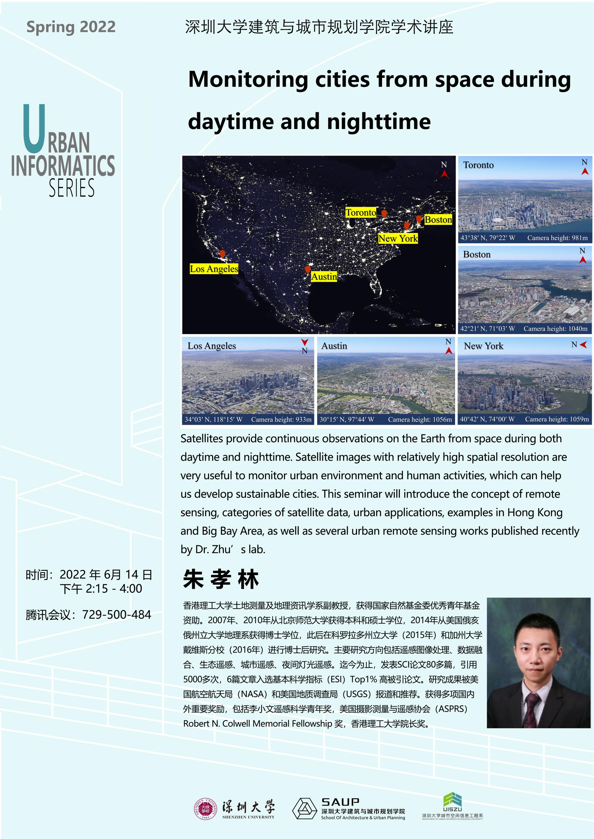 讲座嘉宾:朱孝林,香港理工大学土地测量及地理资讯学系副教授,获得国家自然基金委优秀青年基金资助。2007年、2010年从北京师范大学获得本科和硕士学位,2014年从美国俄亥俄州立大学地理系获得博士学位,此后在科罗拉多州立大学(2015年)和加州大学戴维斯分校(2016年)进行博士后研究。主要研究方向包括遥感图像处理、数据融合、生态遥感、城市遥感、夜间灯光遥感。迄今为止,发表SCI论文80多篇,引用5000多次,6篇文章入选基本科学指标(ESI)Top1% 高被引论文。研究成果被美国航空航天局(NASA)和美国地质调查局(USGS)报道和推荐。获得多项国内外重要奖励,包括李小文遥感科学青年奖,美国摄影测量与遥感协会(ASPRS)Robert N. Colwell Memorial Fellowship 奖,香港理工大学院长奖。