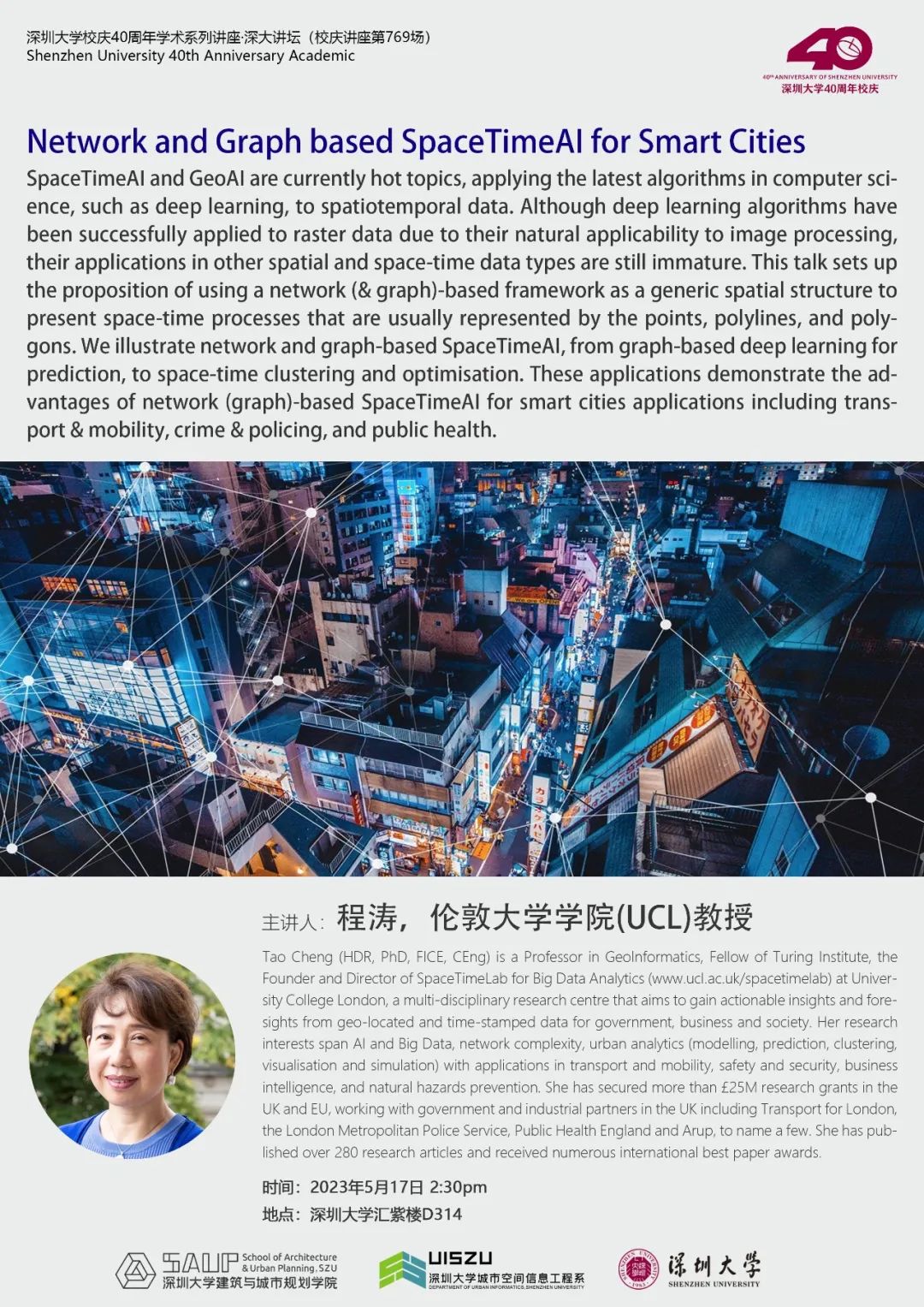 时空人工智能(SpaceTimeAl)和地理空间人工智能(GeoAl)是当前的热门话题,我院城市空间信息工程系特邀伦敦大学学院的SpaceTimeLab创始人兼主任——程涛教授,为大家讲述基于网络和图的智慧城市时空分析, 欢迎各位老师和同学参加!