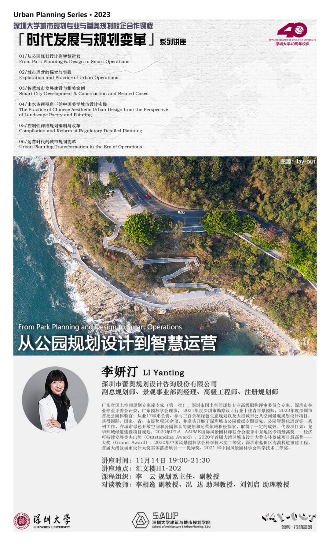 “时代发展与规划变革” 课程是深圳大学城市规划专业与蕾奥规划的校企合作课程之一,由蕾奥规划各专业领域的技术核心联合呈献。第一讲以城市公园规划设计为切入点,论述在城市转型和存量提升的背景下,城市的公共开放空间如何进行运营和功能升级,并通过智慧赋能、数据支撑为城市管理和公园的可持续发展提供解决途径。