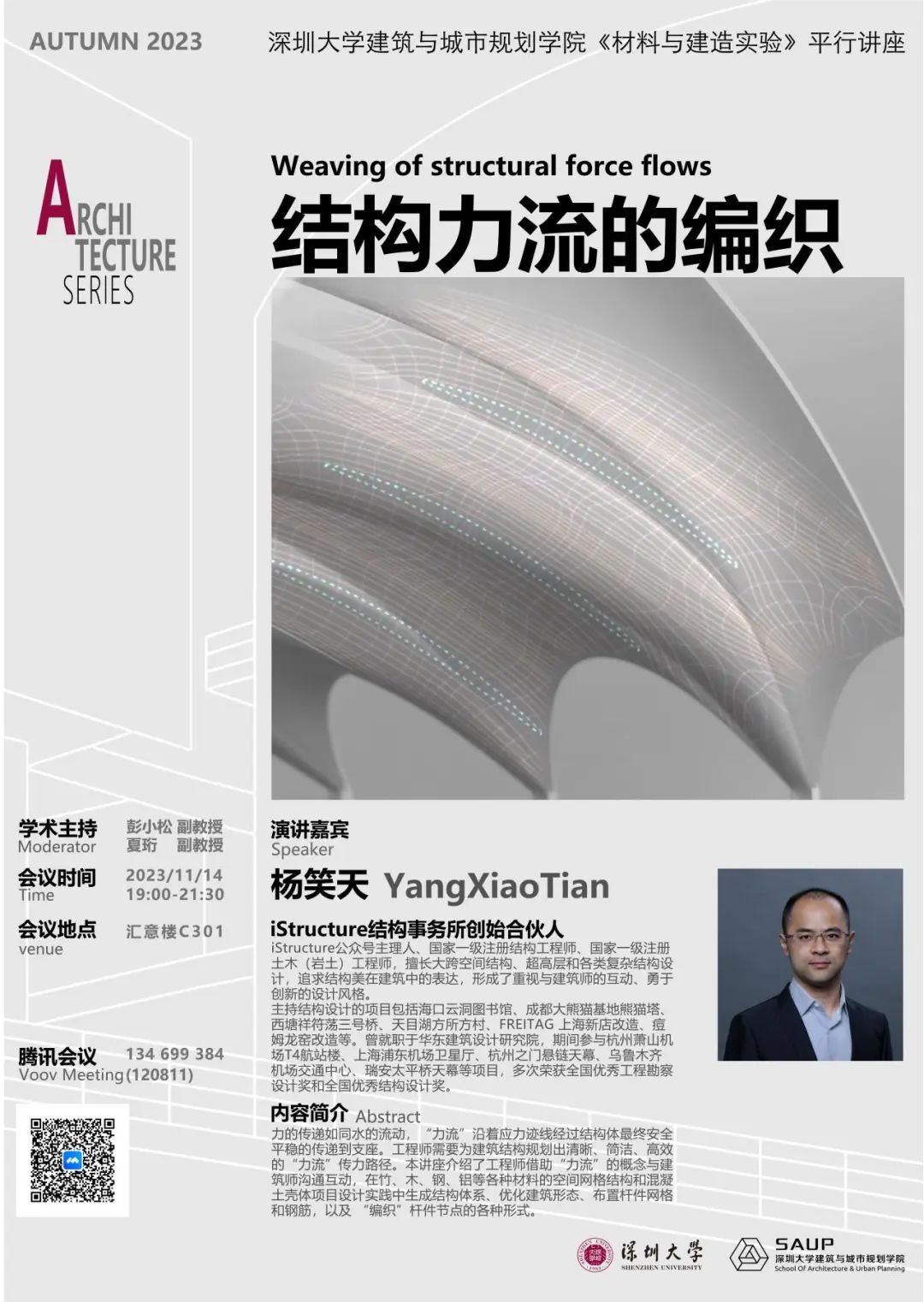 力的传递如同水的流动,“力流”沿着应力迹线经过结构体最终安全平稳的传递到支座。工程师需要为建筑结构规划出清晰、简洁、高效的“力流”传力路径。本讲座介绍了工程师借助“力流”的概念与建筑师沟通互动,在竹、木、钢、铝等各种材料的空间网格结构和混凝土壳体项目设计实践中生成结构体系、优化建筑形态、布置杆件网格和钢筋,以及 “编织”杆件节点的各种形式。