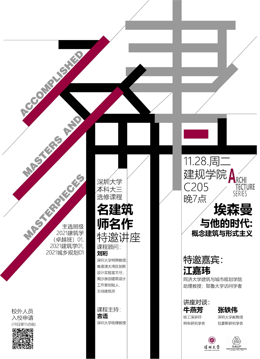 彼得·埃森曼(Peter Eisenman)对现当代西方建筑理论举足轻重,围绕建筑形式(form)提出过纷繁复杂的理论。这些理论可被简要概括为概念建筑(conceptual architecture)与形式主义(formalism)。本讲座首先介绍埃森曼在第二次世界大战之后西方建筑理论圈子(北意大利、法国巴黎、伦敦-纽约)的位置,从他1963年的博士论文《现代建筑的形式基础》讲到1970年代的概念建筑理论。同时分析以上理论对埃森曼建筑设计作品的影响,并介绍埃森曼在耶鲁大学为硕士研究生开设的形式分析课程。