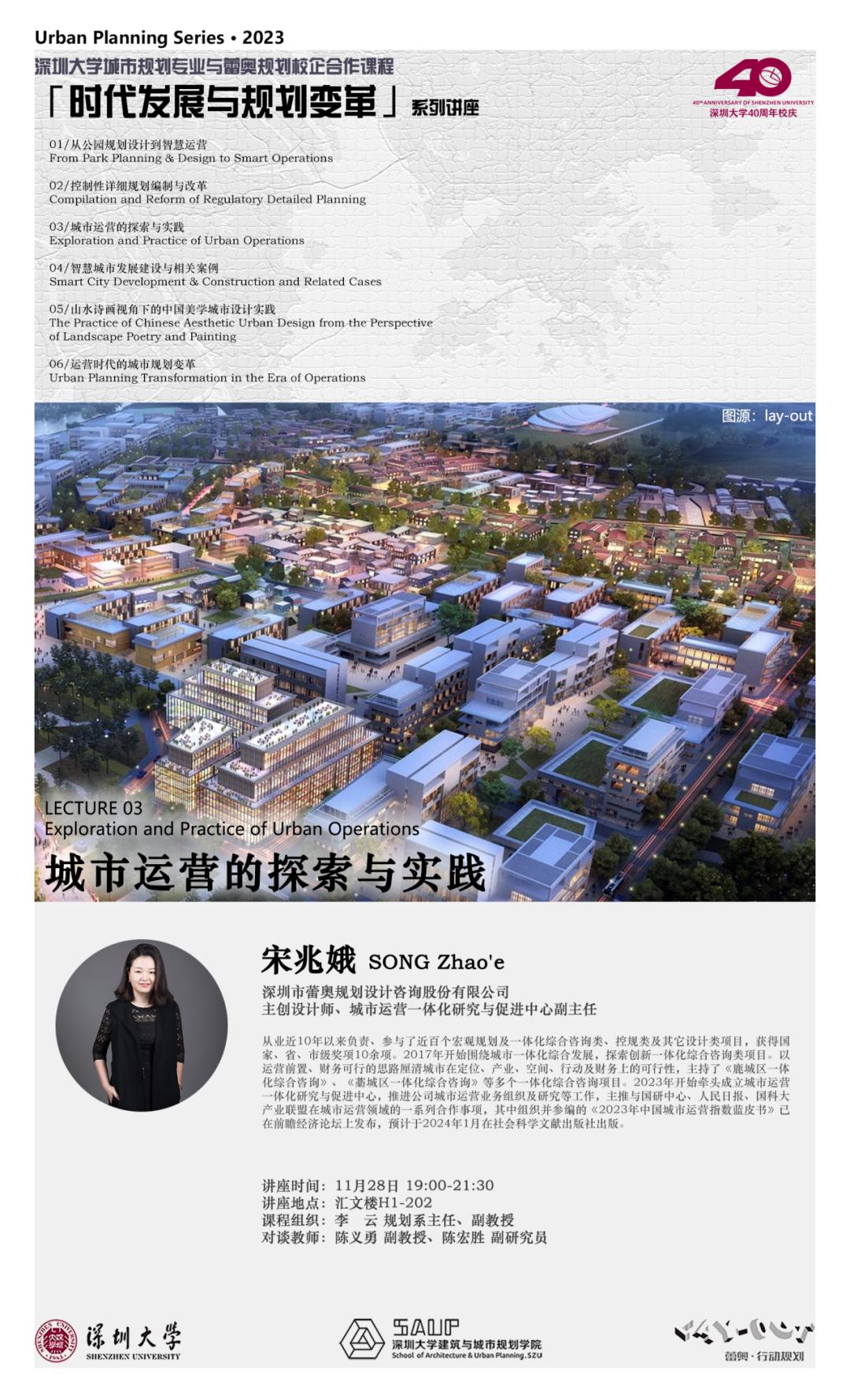 “时代发展与规划变革” 课程是深圳大学城市规划专业与蕾奥规划的校企合作课程之一,由蕾奥规划各专业领域的技术核心联合呈献。第三讲以公司运营业务布局为切入点,展示公司目前在城市运营板块的战略做法及成效;以《2023年中国城市运营指数蓝皮书》为核心分享内容,分析评估中国296个城市的运营评估情况,从稳定收入、要素运营、盘活资产和民生增效等方面提出城市运营的解决建议。